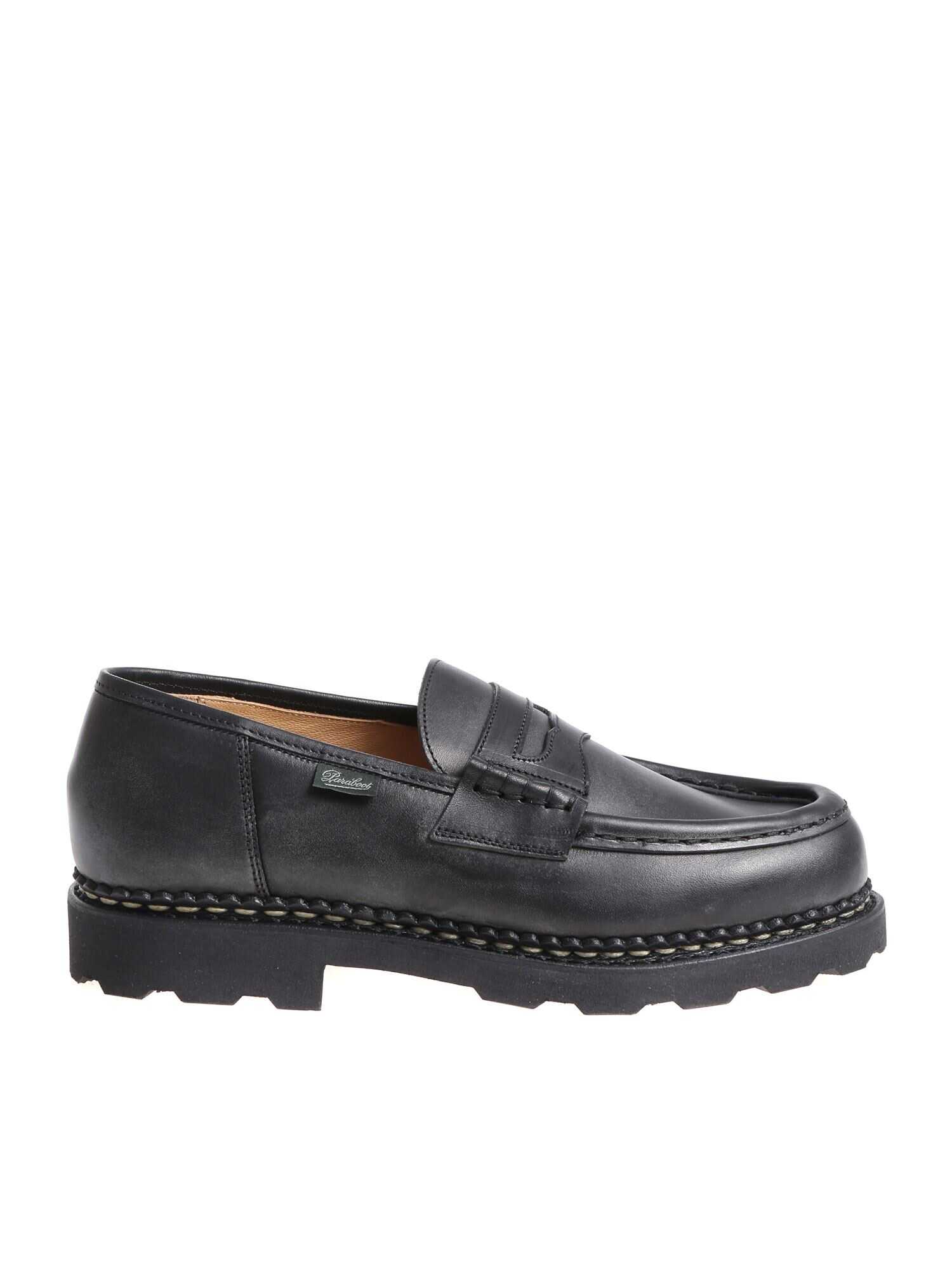 Paraboot Loafer in black leather, visible stitching, rubber sole, leather insole, rubber sole.