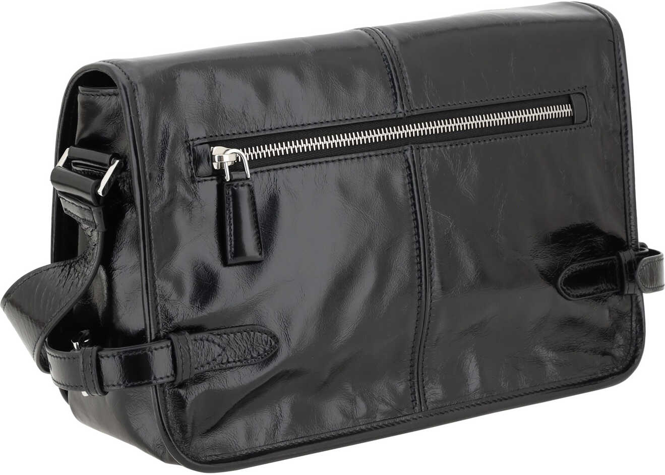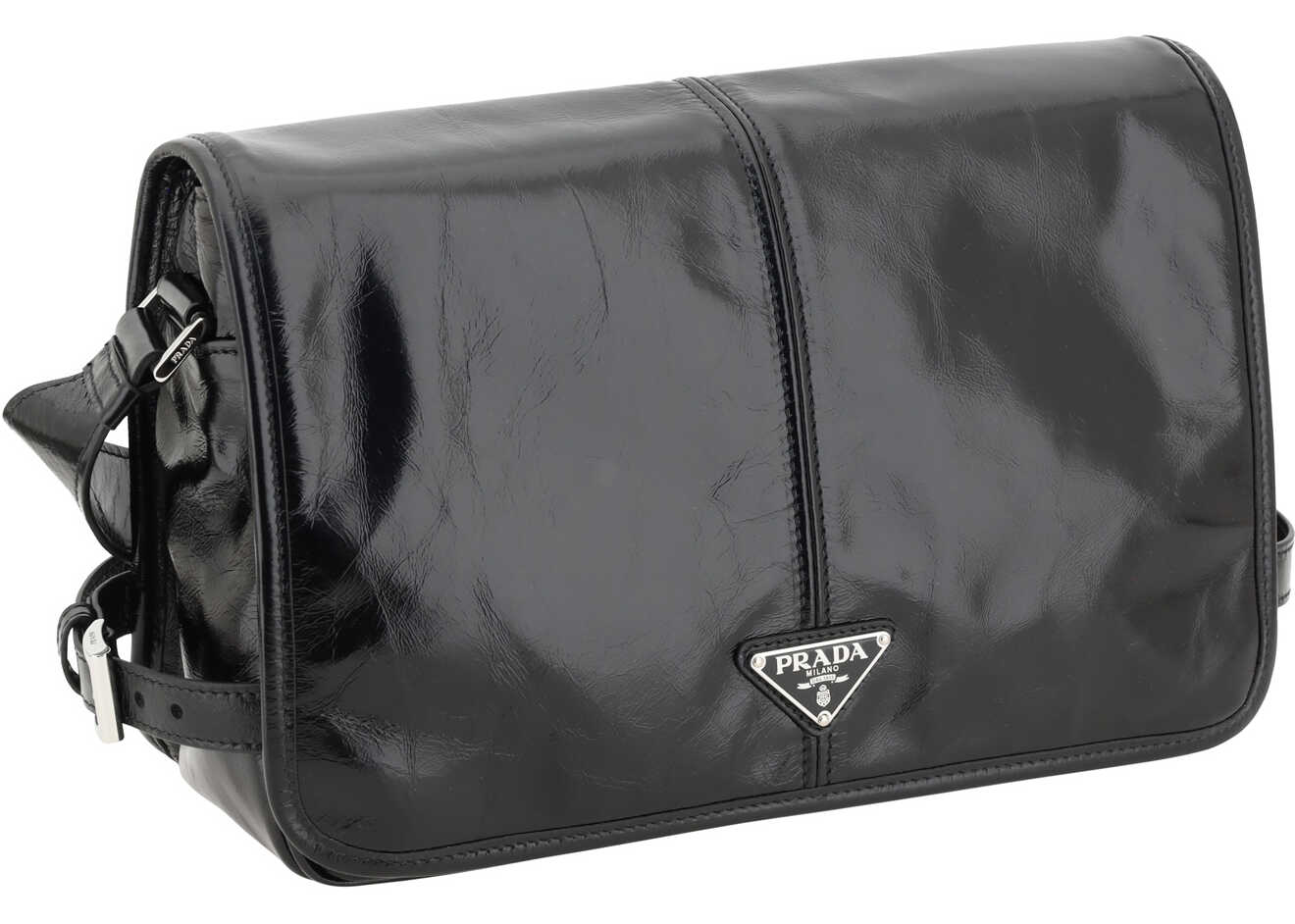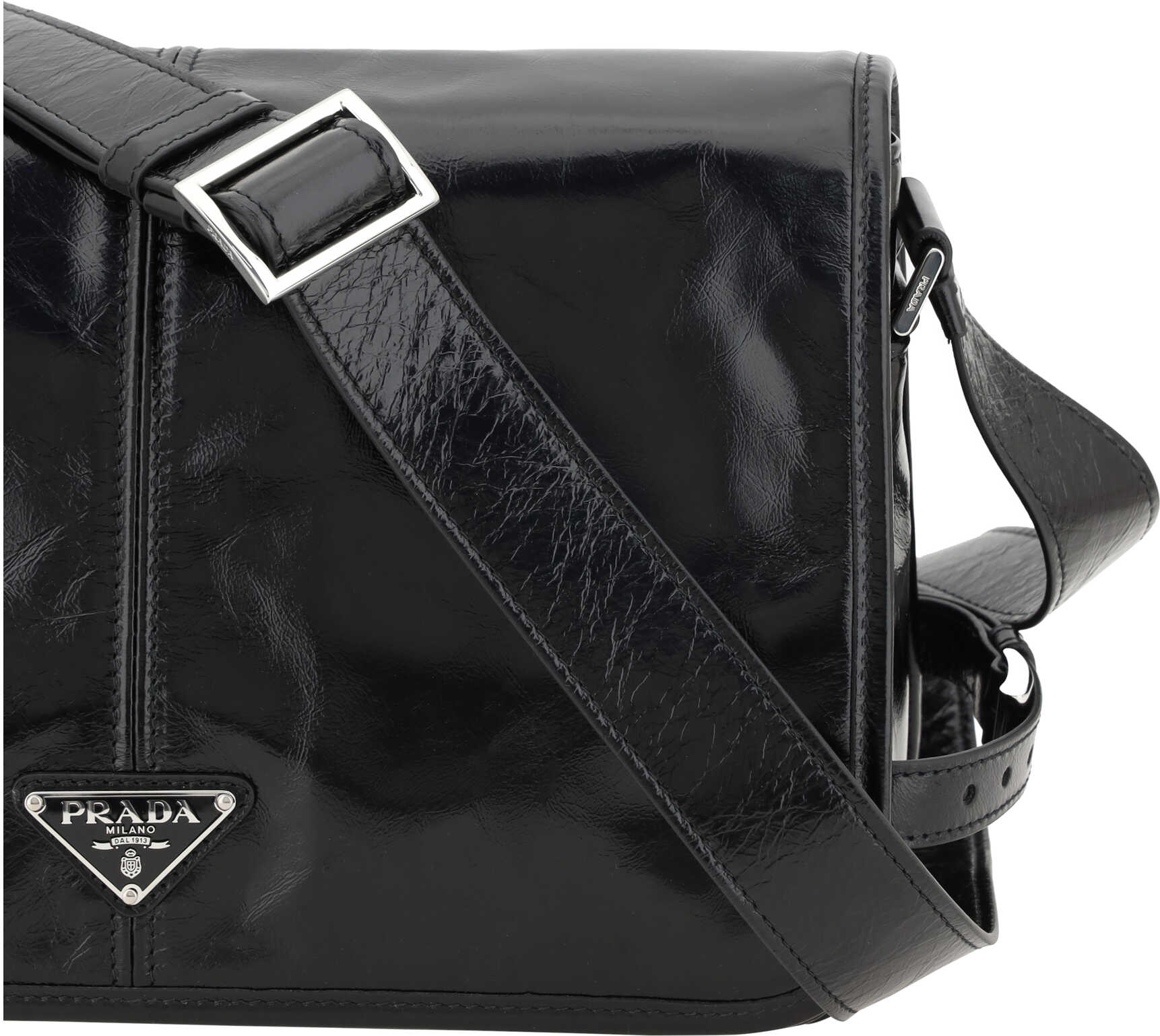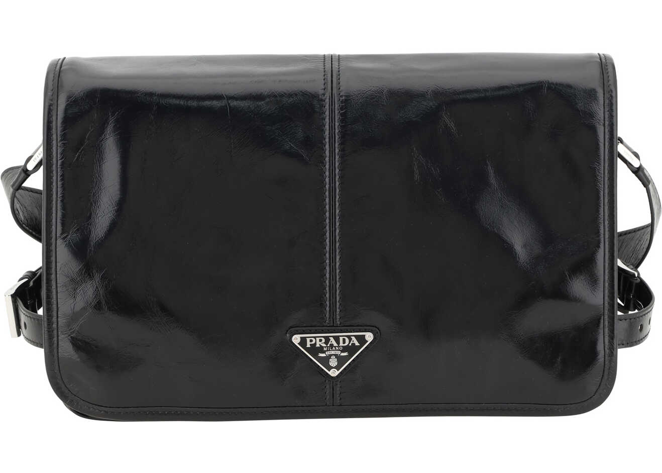 Leather Shoulder Bag by Prada, an adjustable flat shoulder strap, front closure by magnetic flap, dual interior compartments, a welt pocket on the back with a zipper, iconic three-dimensional, enameled brand plaque applied to the front, and a patent leather design.