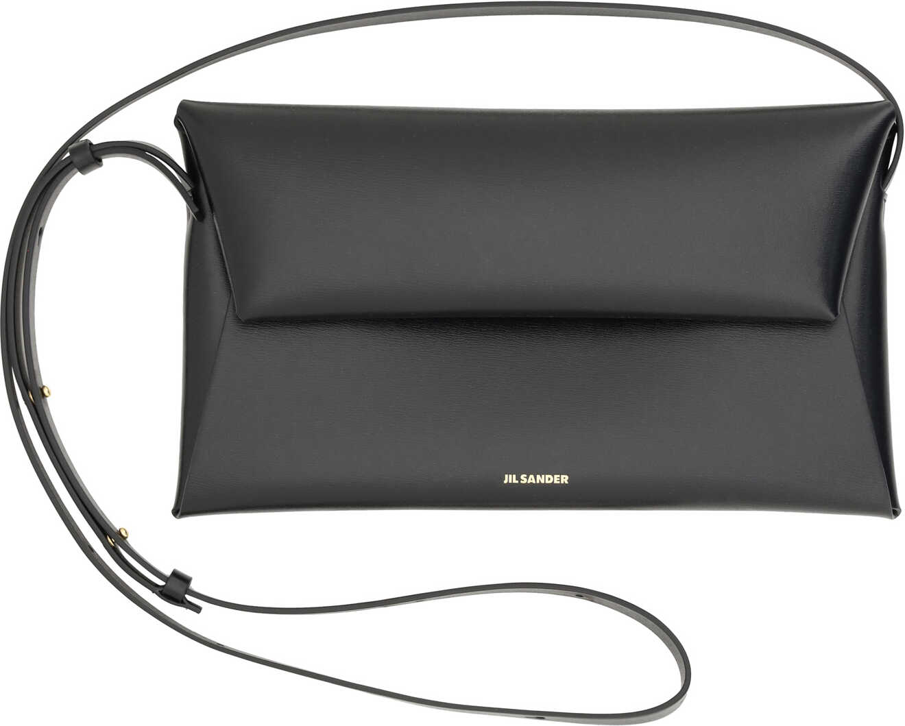 Leather Shoulder Bag by Jil Sander, an adjustable flat shoulder strap, front closure by magnetic flap, iconic brand monogram press-stamped on front, single interior compartment, monochrome pattern.