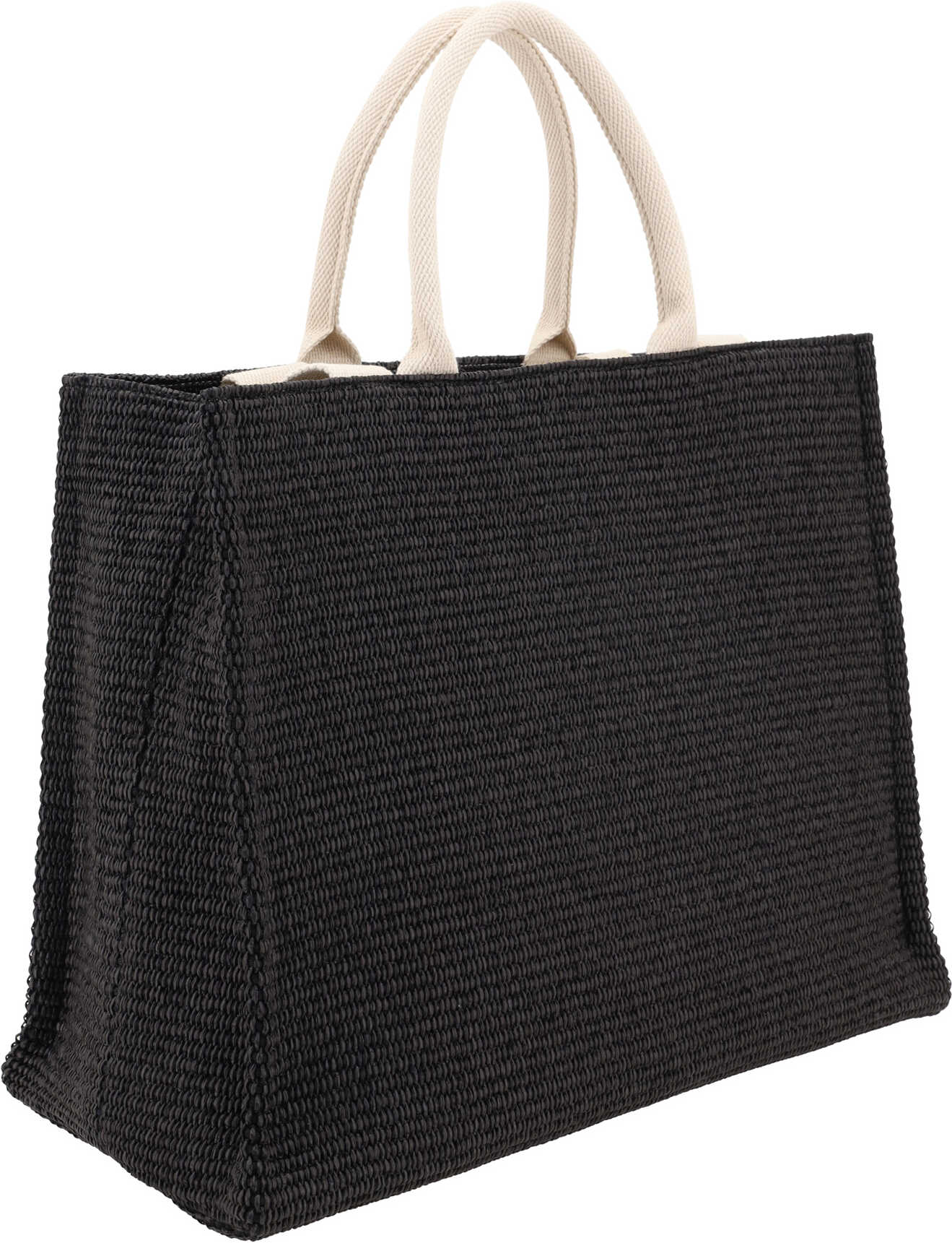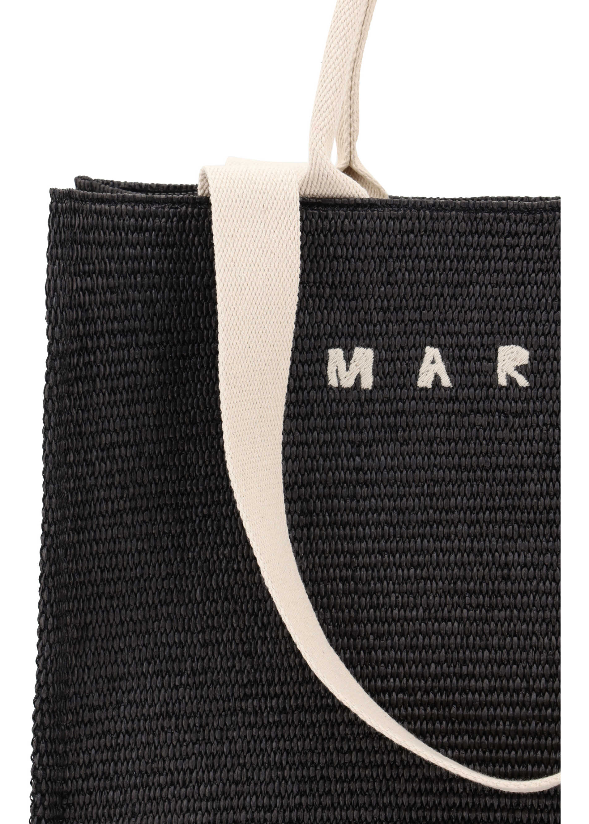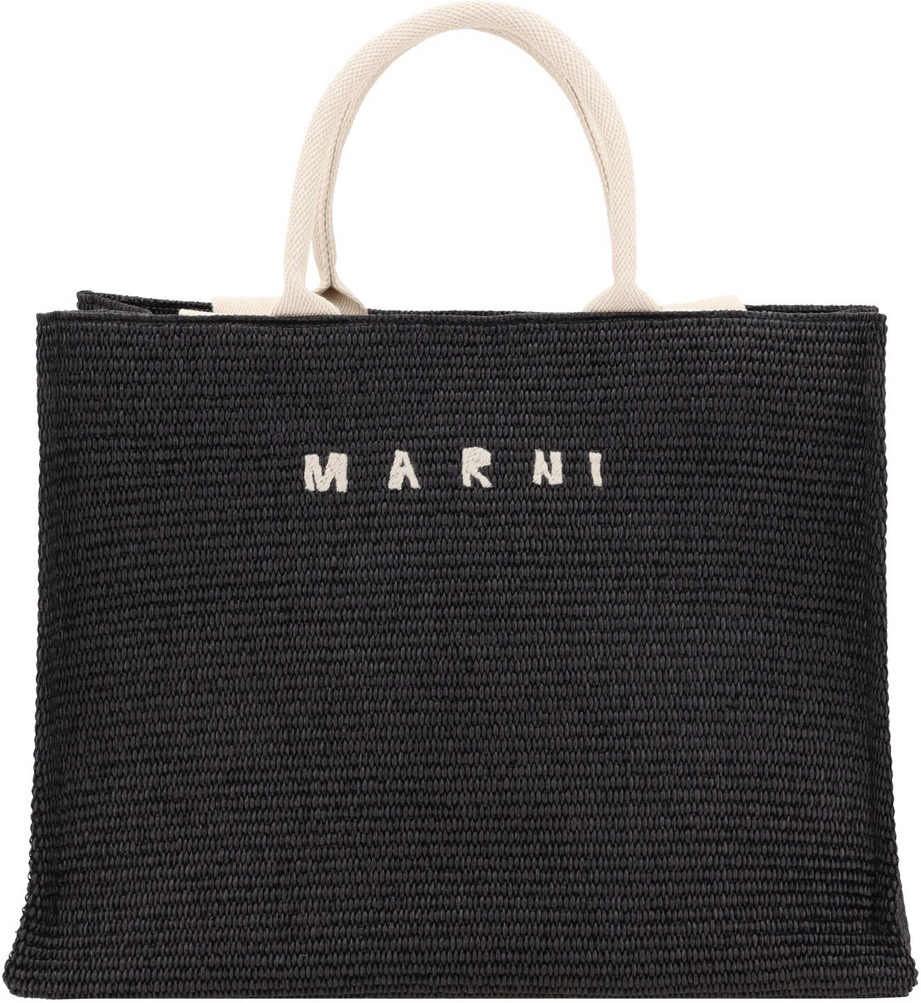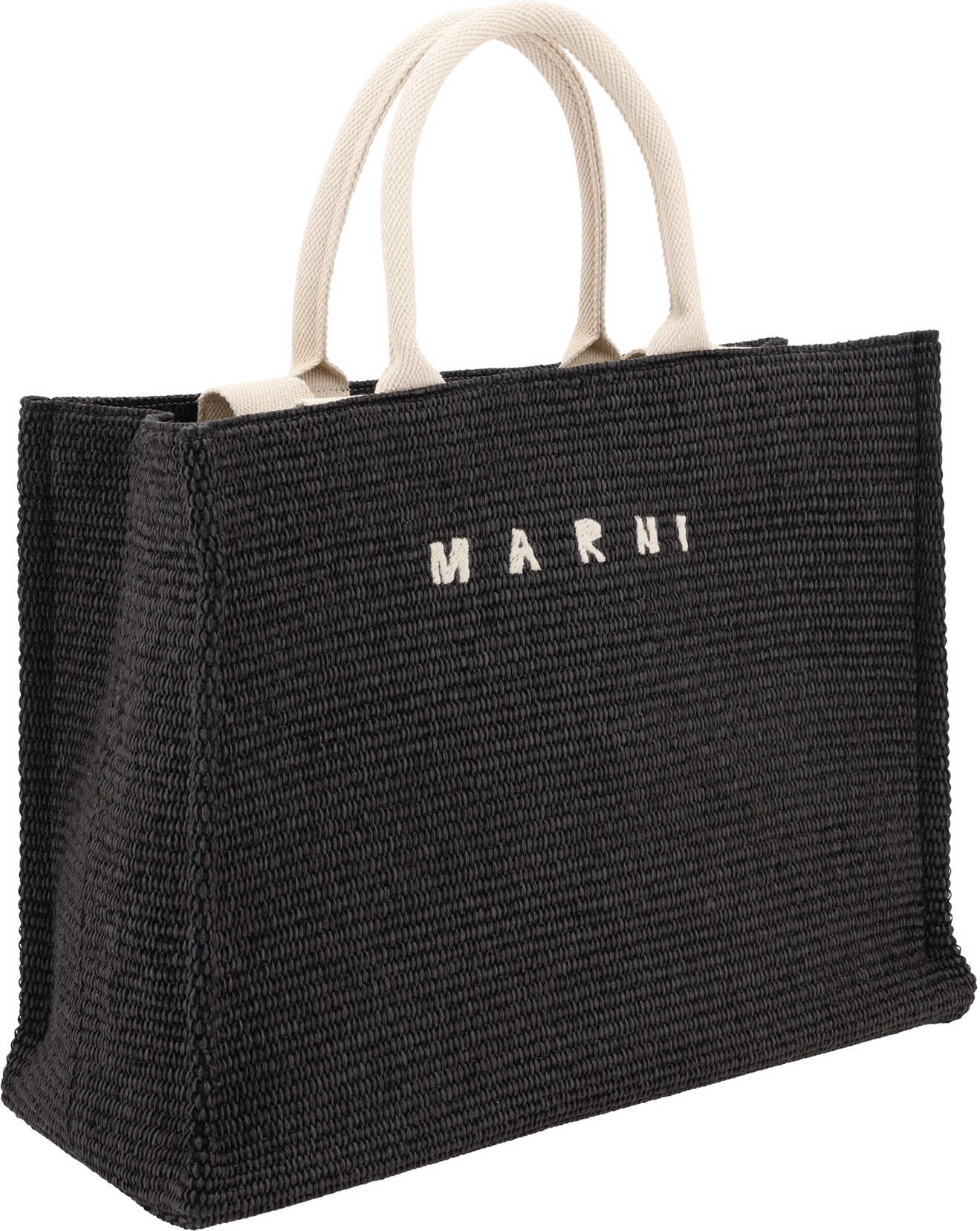 Raffia Tote Handbag by Marni, two stiff cotton handles, contrasting brand logo on front, contrasting fabric shoulder strap, inside closure, fabric lining with zippered welt pocket.