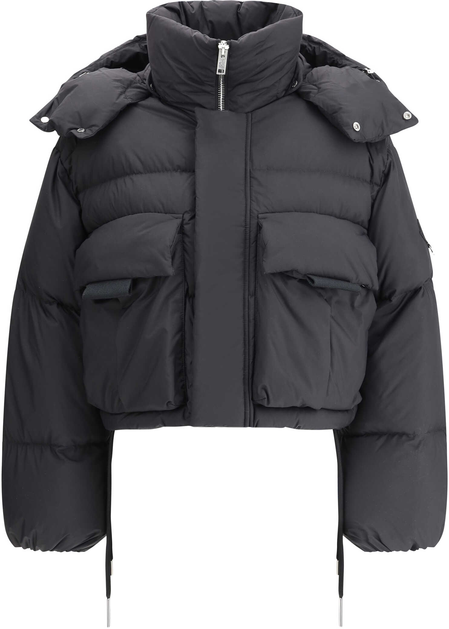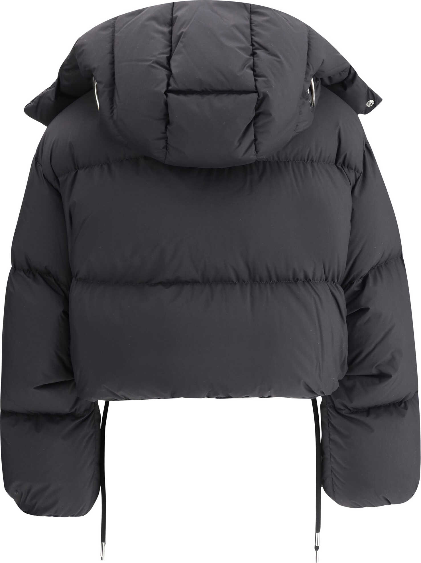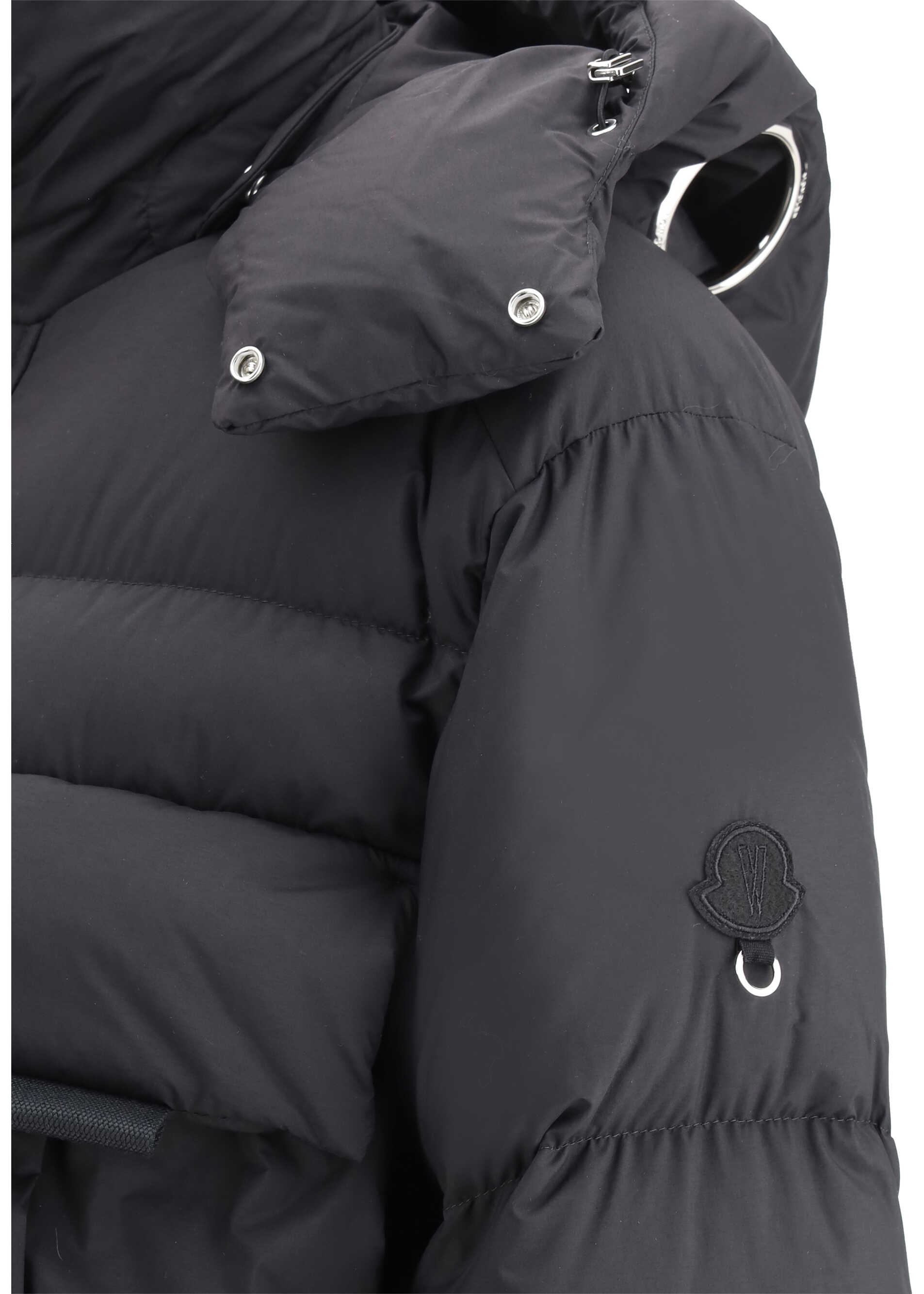 Kar Down Jacket by Moncler x Willow Smith, cropped model, high collar, removable hood embellished with contrasting maxi eyelets, front zipper and snap button flap closure, two maxi flap patch pockets on front, adjustable drawstring hem, iconic brand logo patch applied on left sleeve, elastic cuffs, all-over quilted and padded design, loose fit.