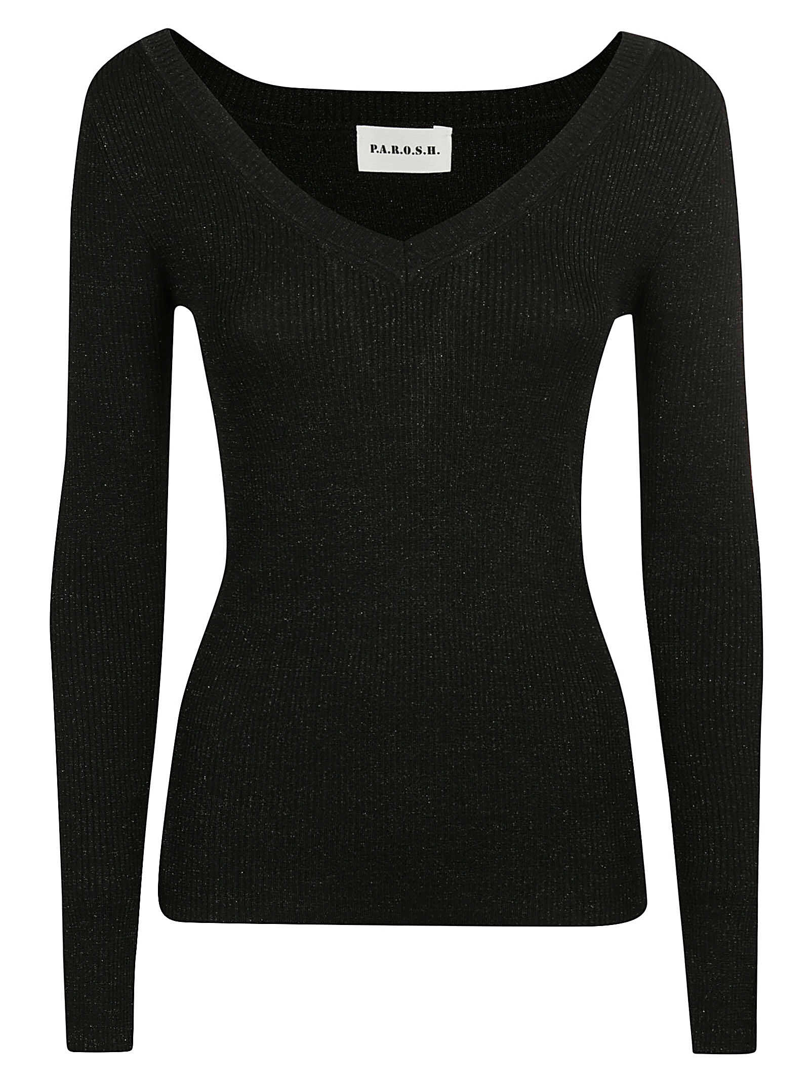 Black wool blend ribbed-knit jumper from P.A.R.O.S.H. featuring ribbed knit, lurex detailing, V-neck, long sleeves and straight hem.