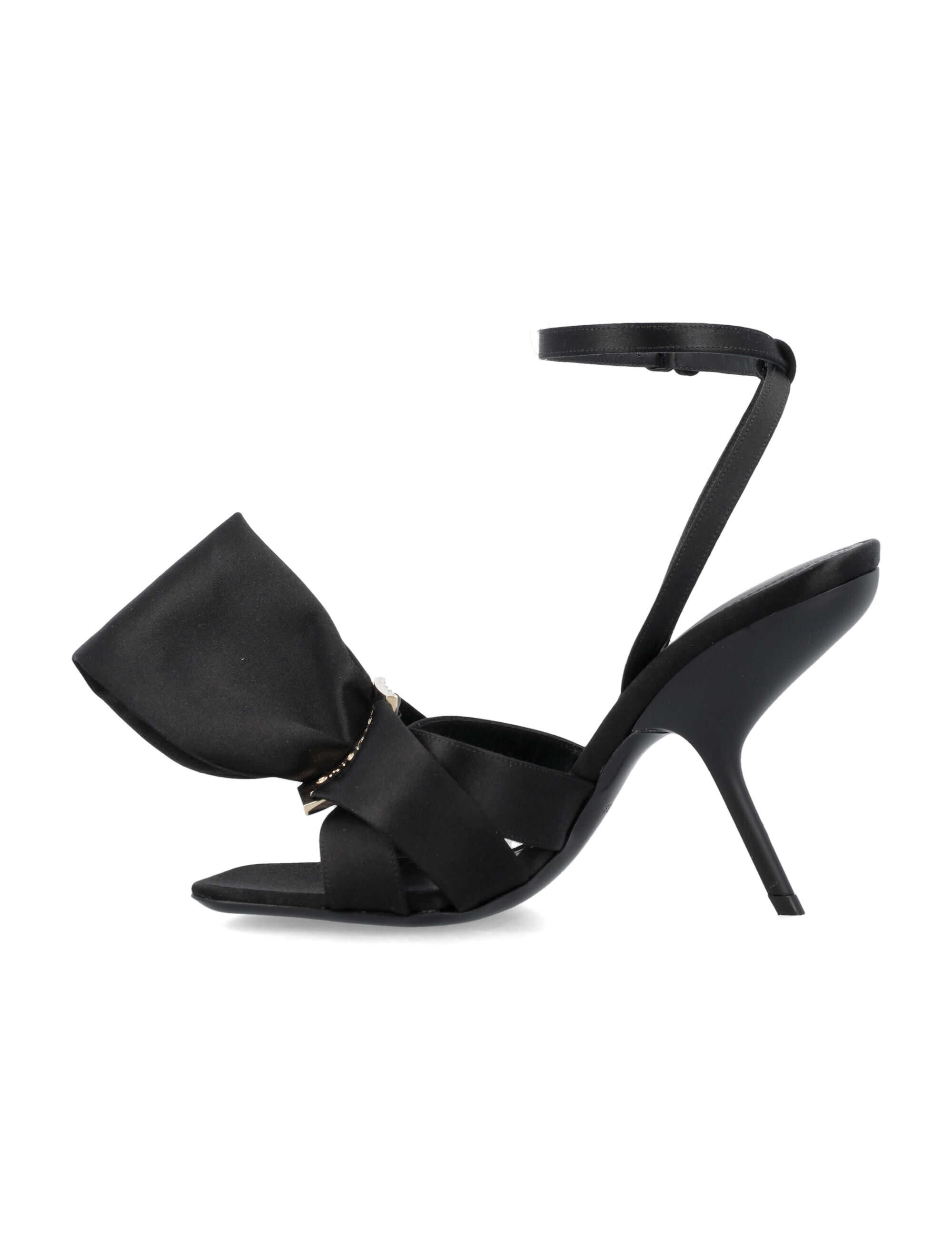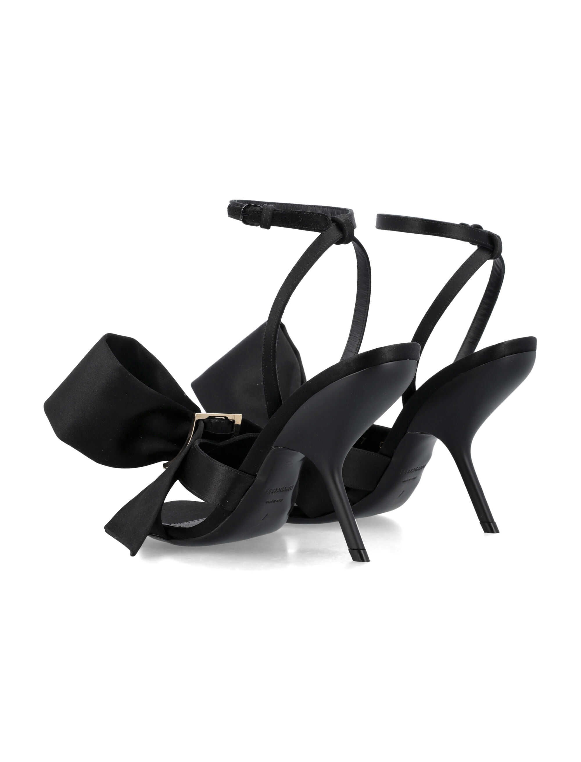 Introducing the FERRAGAMO Sandal with asymmetric bow in BLACK. This closed-toe sandal features a glossy satin upper adorned with an asymmetrical maxi-bow. The adjustable ankle strap and slim, shaped heel provide a comfortable yet stylish fit. Crafted with high-quality materials including fabric, goat leather lining, and a durable bos taurus sole. Elevate your style with this exquisite FERRAGAMO Sandal. Heel height: 10.5cm.