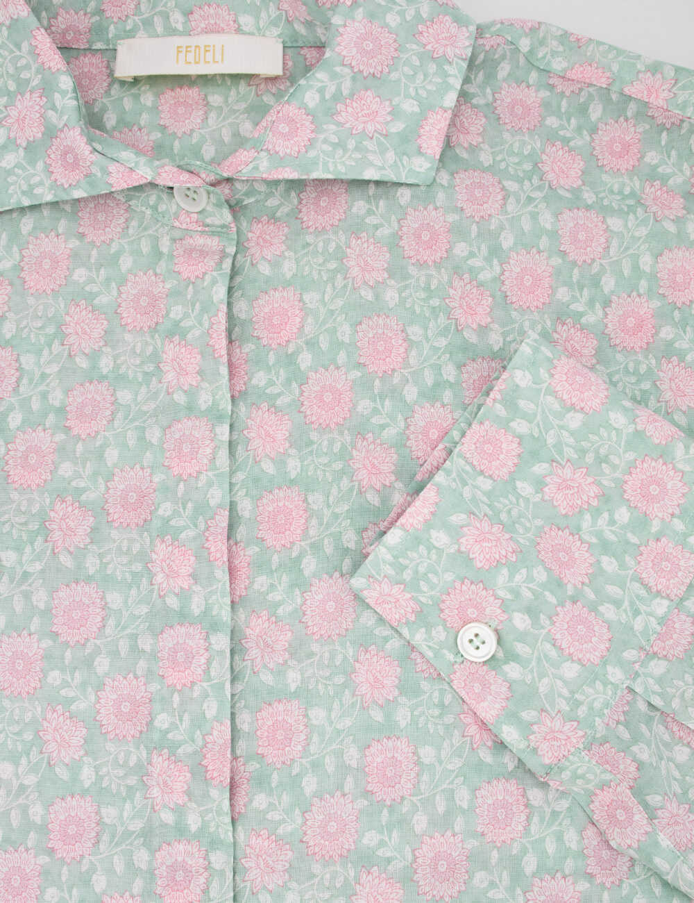 Elevate your summer style with this Light Pink Blouse from FEDELI. Made of premium stretch panamino cotton, it features a chic mediterranean inspired print and a relaxed fit for all-day comfort. Complete with mother of pearl button fastening, this blouse is a must-have for any fashion-forward woman. Add a touch of elegance to your wardrobe with this versatile piece.