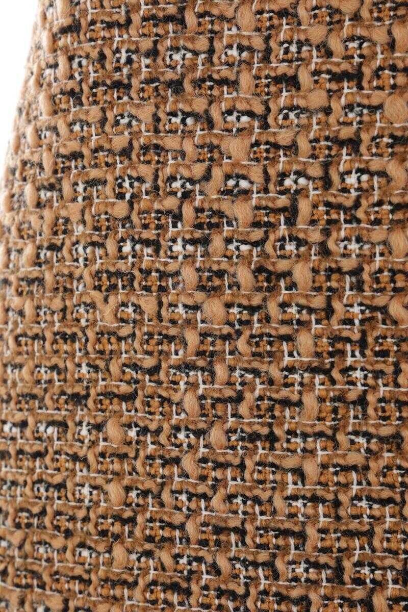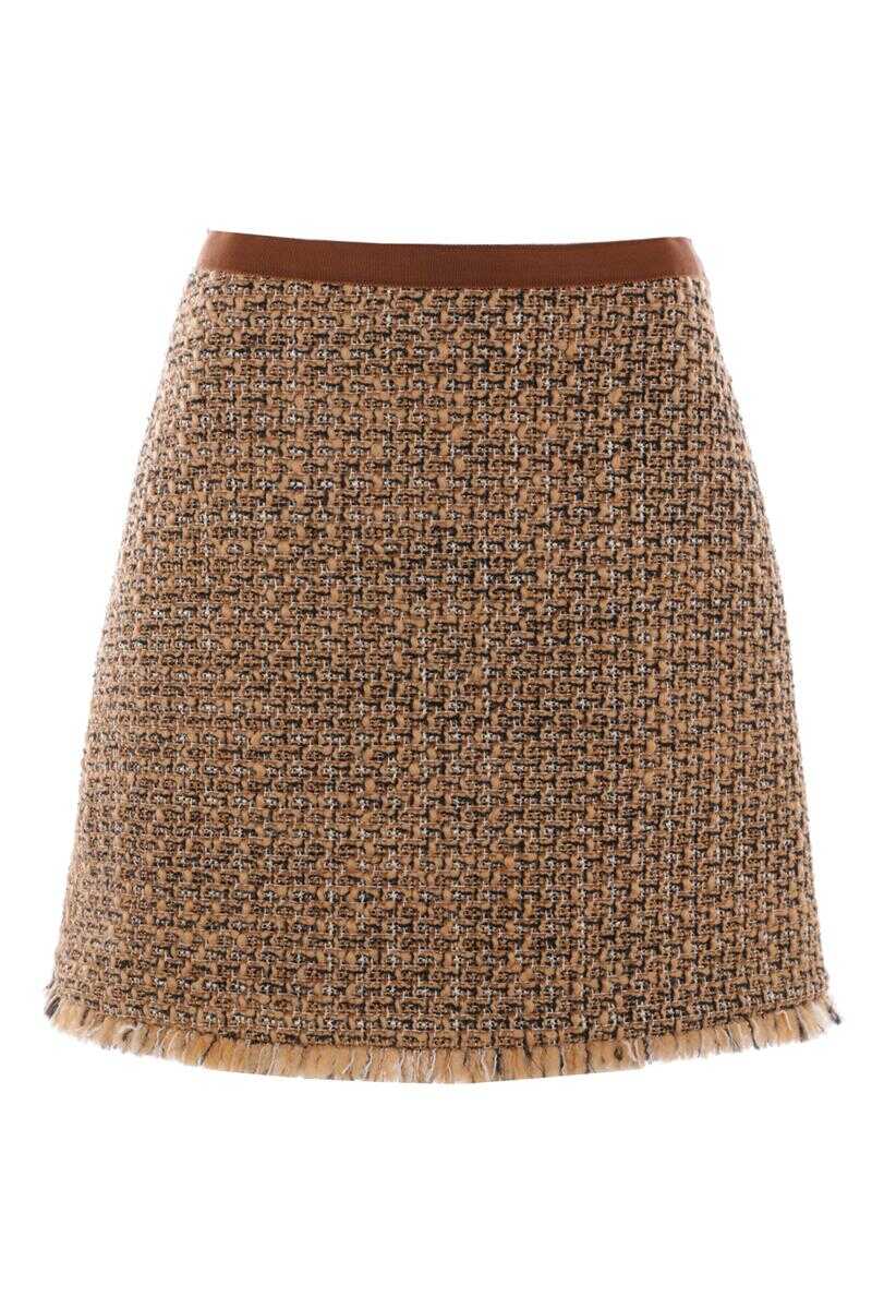 Valentino Garavani miniskirt made of brown and black tweed with a grosgrain waistband. Featuring a side closure with hook and invisible zipper, fringed hem, and lined interior.