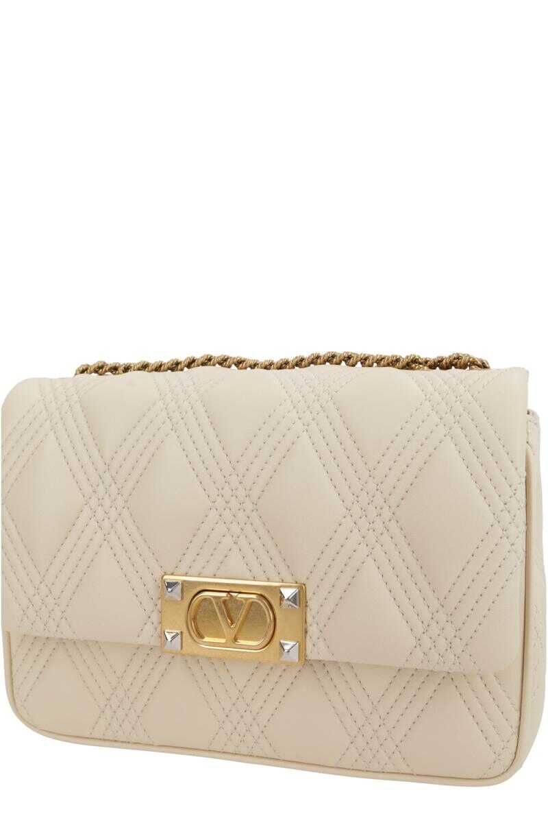 Valentino Garavani shoulder bag made of ivory quilted nappa leather. Featuring antiqued gold-tone hardware, push-lock closure on the flap, and an adjustable chain strap with two length options. The tone-on-tone nappa-lined interior includes a zip pocket and a card slot. The design is completed with the VLogo Signature plaque and signature studs.