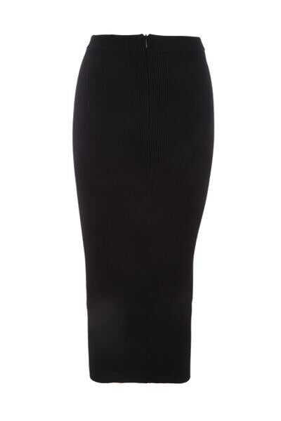 Alexander McQueen's fitted pencil midi skirt crafted in black ribbed stretch wool knit. Featuring invisible zip closure along left side and straight hem. Unlined interior.