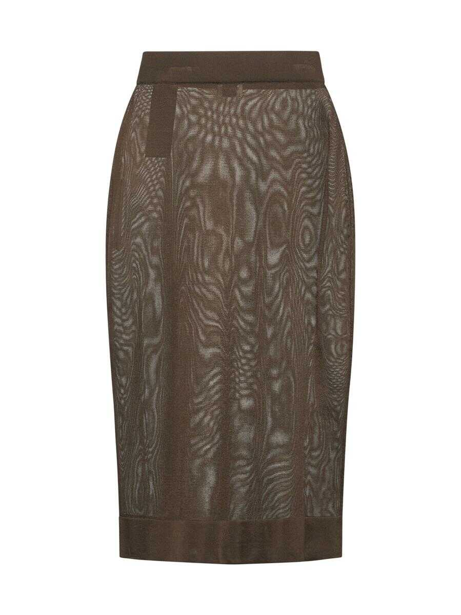 Saint Laurent’s brown sheer viscose knit pencil midi skirt featuring an elasticated high waist and a fitted silhouette.