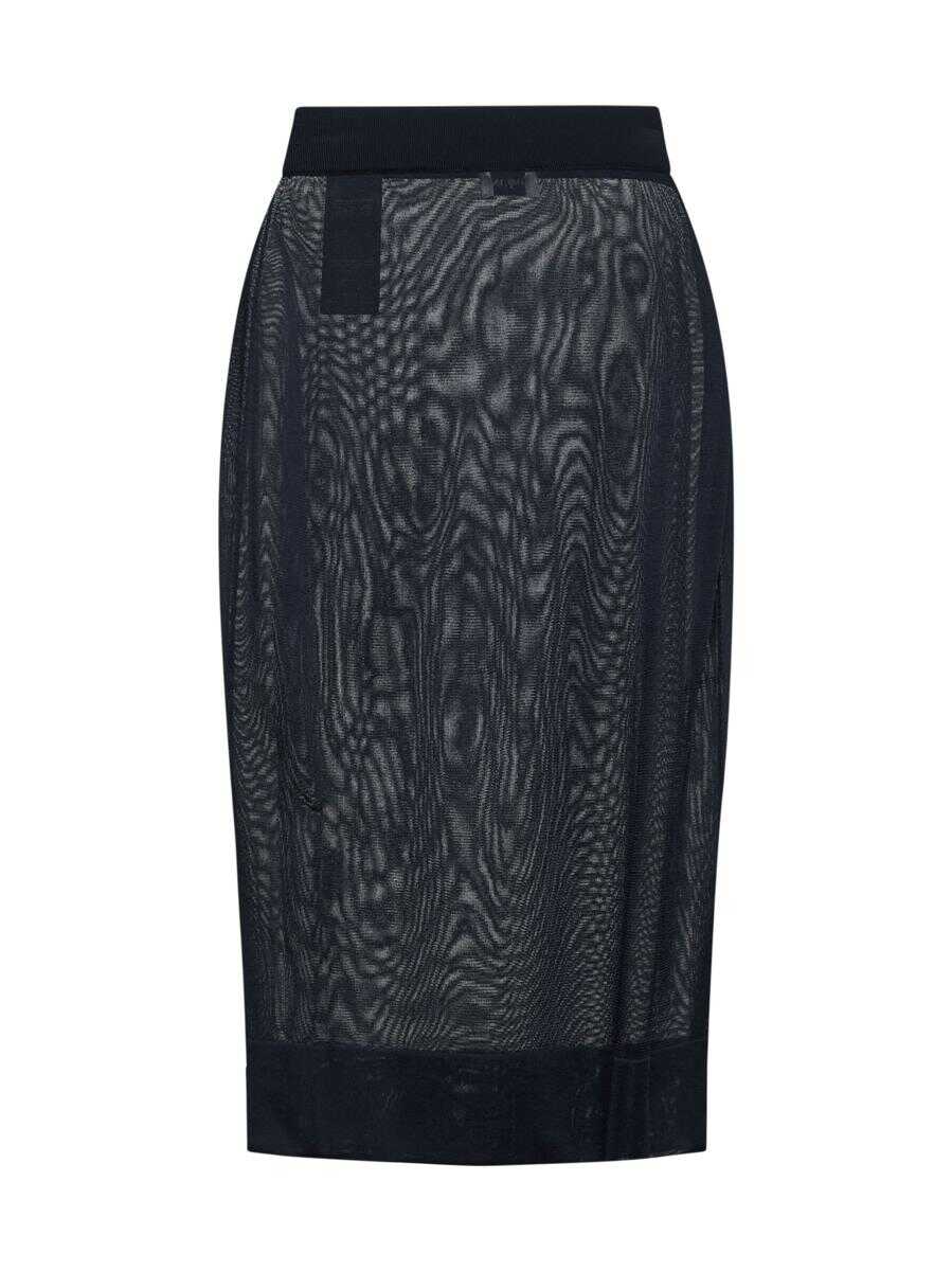 Saint Laurent’s midnight blue sheer viscose knit pencil midi skirt featuring an elasticated high waist and a fitted silhouette.