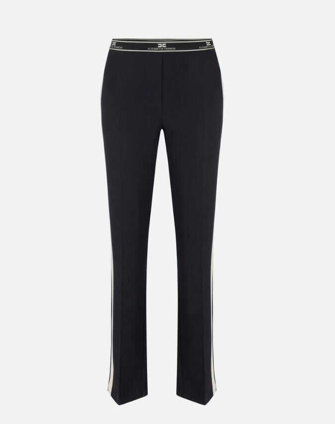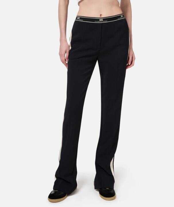 Straight trousers in light crepe with French pockets on the front and welt pockets on the back. It is characterized by slits at the bottom, satin side band in contrasting color and elastic band with logo.