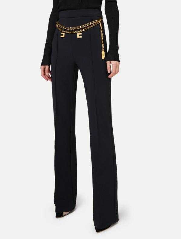 Palazzo trousers in double stretch crêpe. The waist is emphasized by a tucked-in chain belt and golden metal logo charms.
