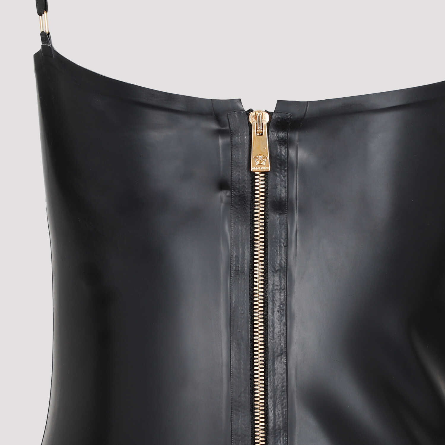Elevate your style with this stunning Versace black latex dress. Featuring a sleek design with a bra cup effect, midi length, and golden logoed hardware on the spaghetti straps. Made from 100% latex, this dress is perfect for making a bold fashion statement. Stand out in VERSACE 1005491.1A02569!
