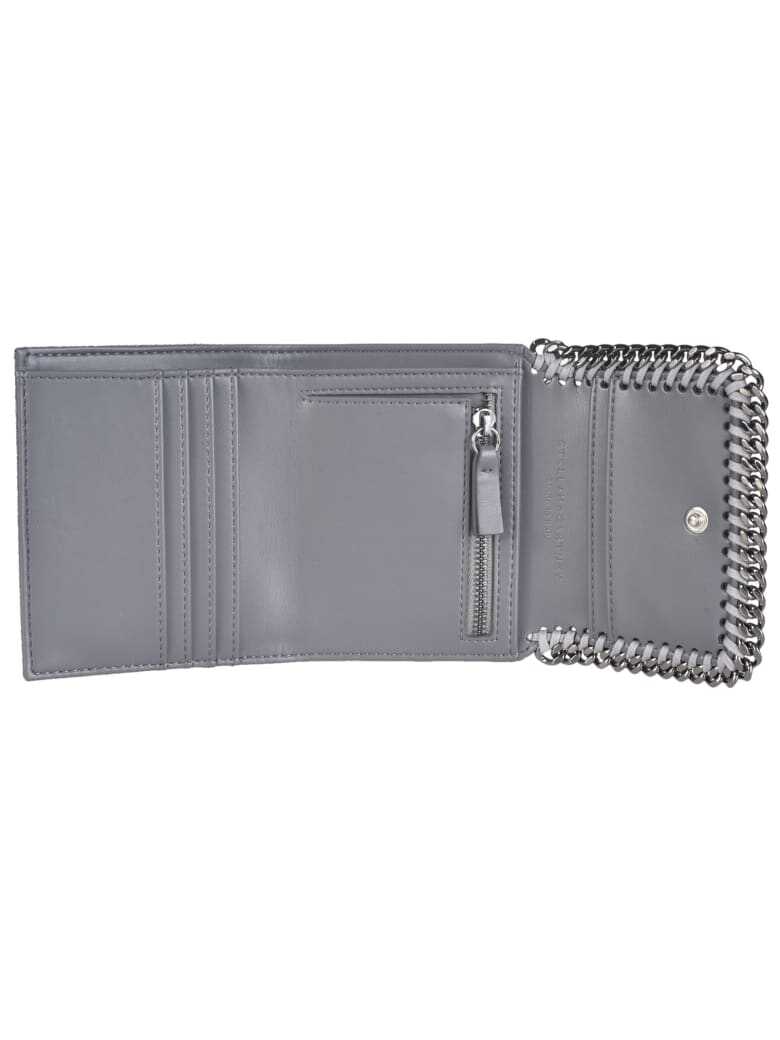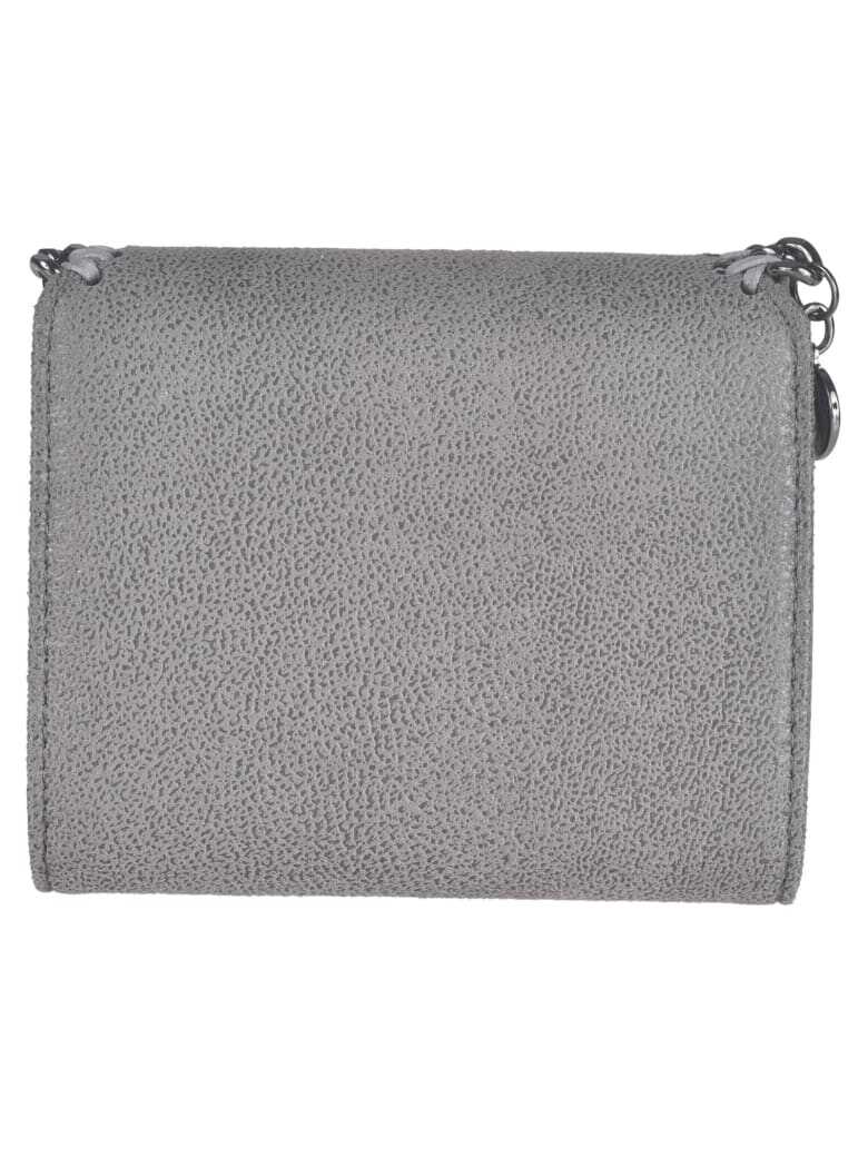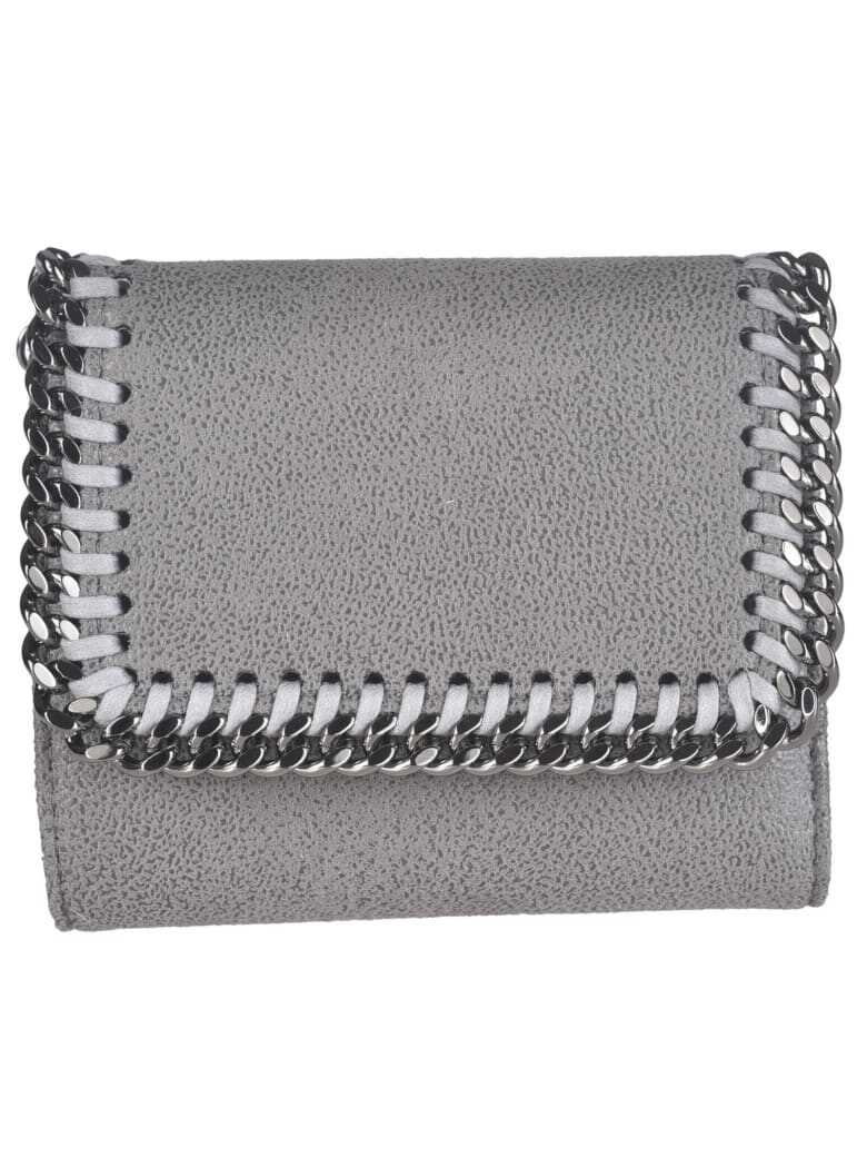 Elevate your accessory game with this stylish Grey Falabella flap wallet from Stella McCartney. Crafted from faux leather with signature chain-link trim and whipstitch detailing, this wallet features a range of compartments for your essentials. Make a conscious choice with this animal-friendly product from a brand that cares. Add a touch of luxury to your everyday essentials!