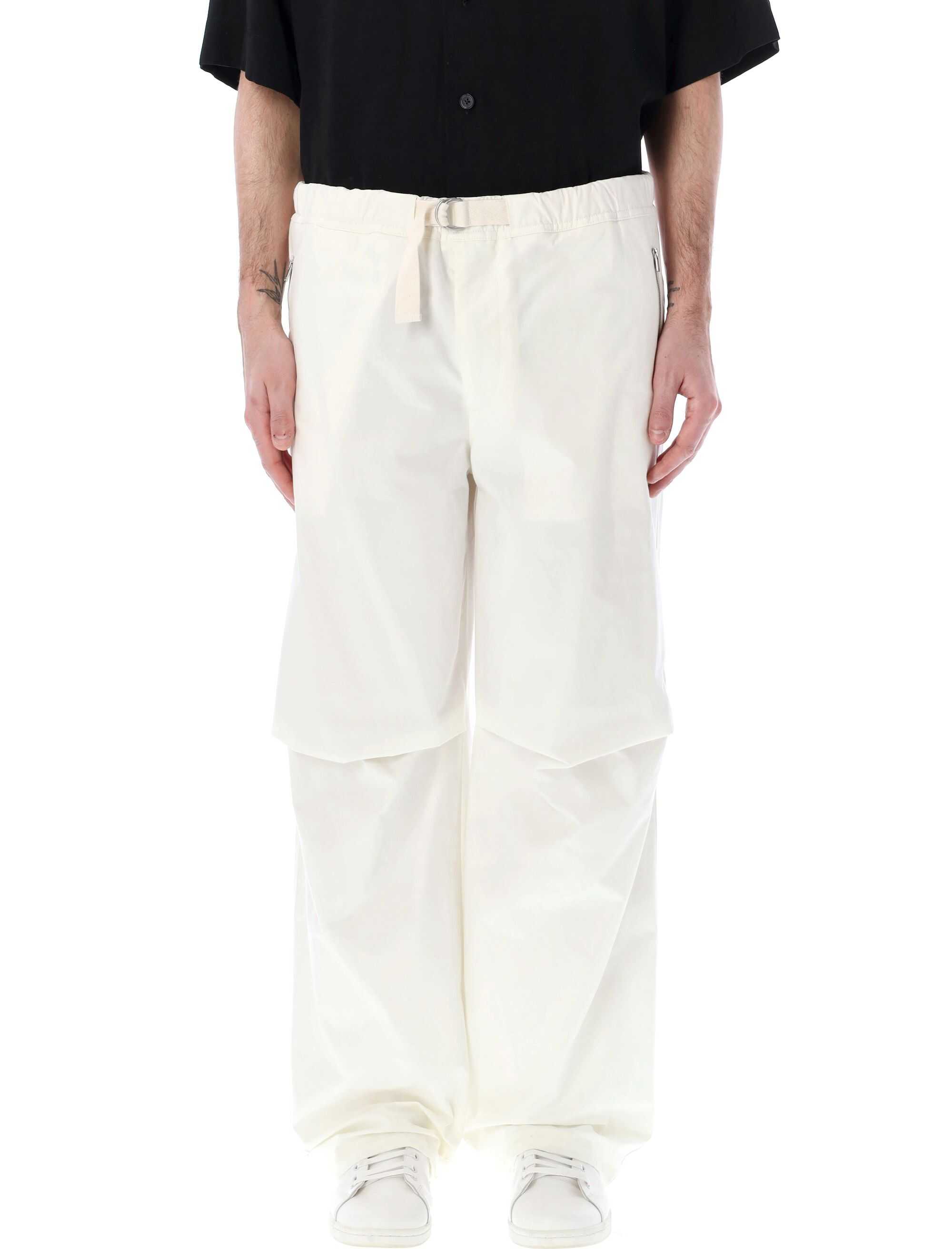 Step out in style with these Egg Shell colored belted cargo pants from Jil Sander. Made from 100% cotton, these pants feature an elastic waist with an adjustable belt, zip fly, side zipped pockets, back pockets, and an embroidered logo at the left knee. Complete your look with these versatile and comfortable pants. Perfect for any occasion.