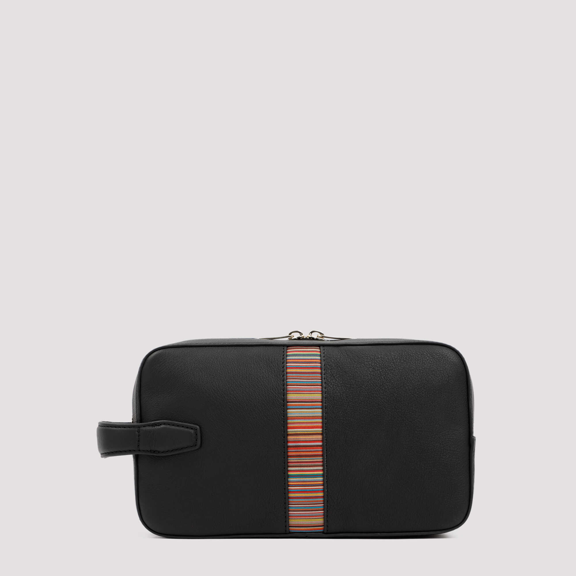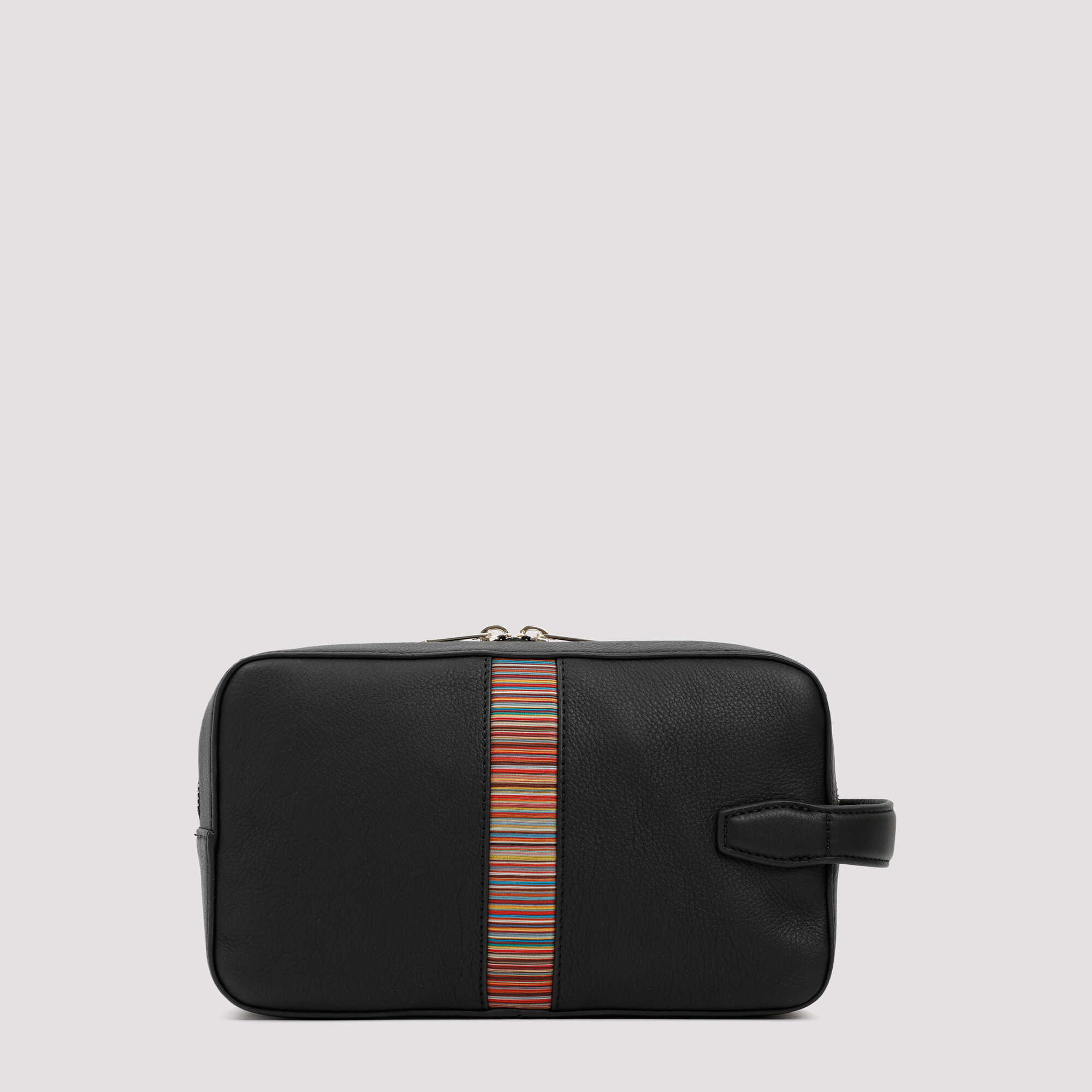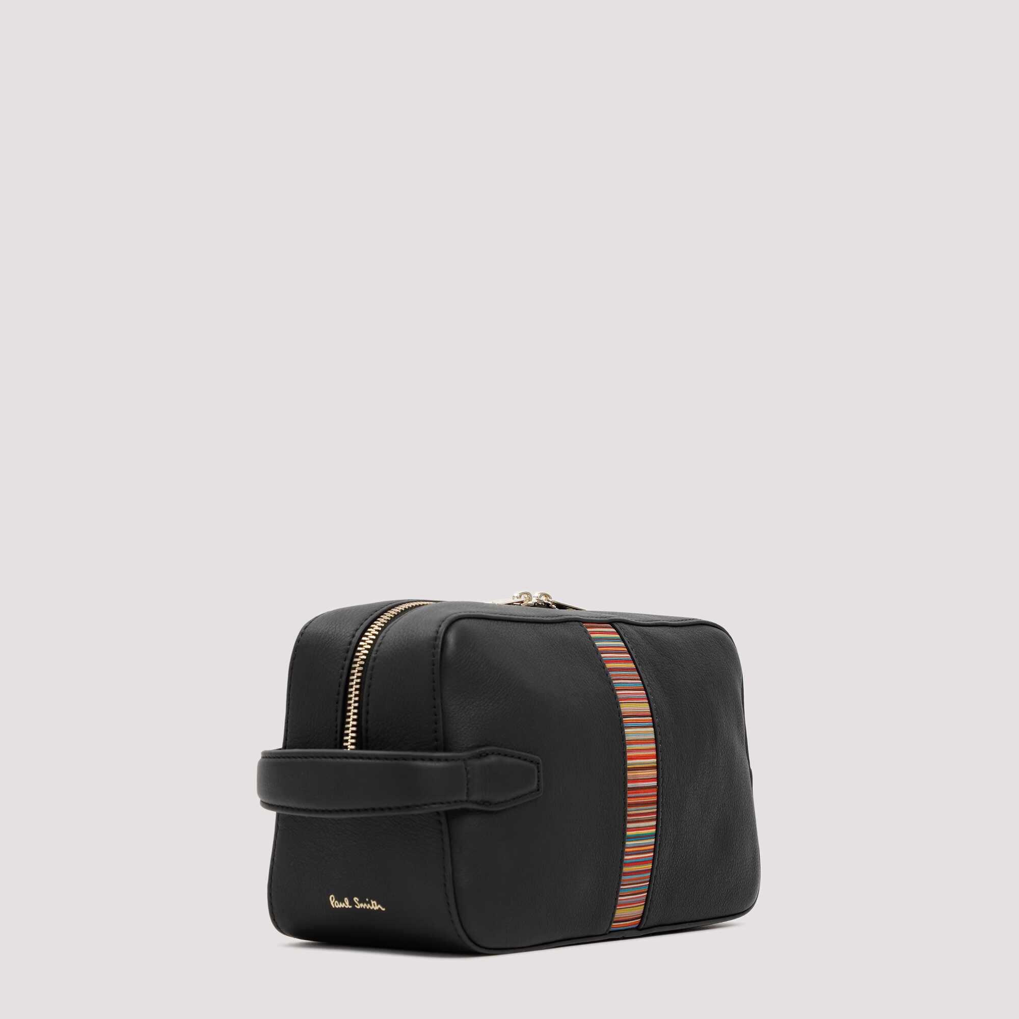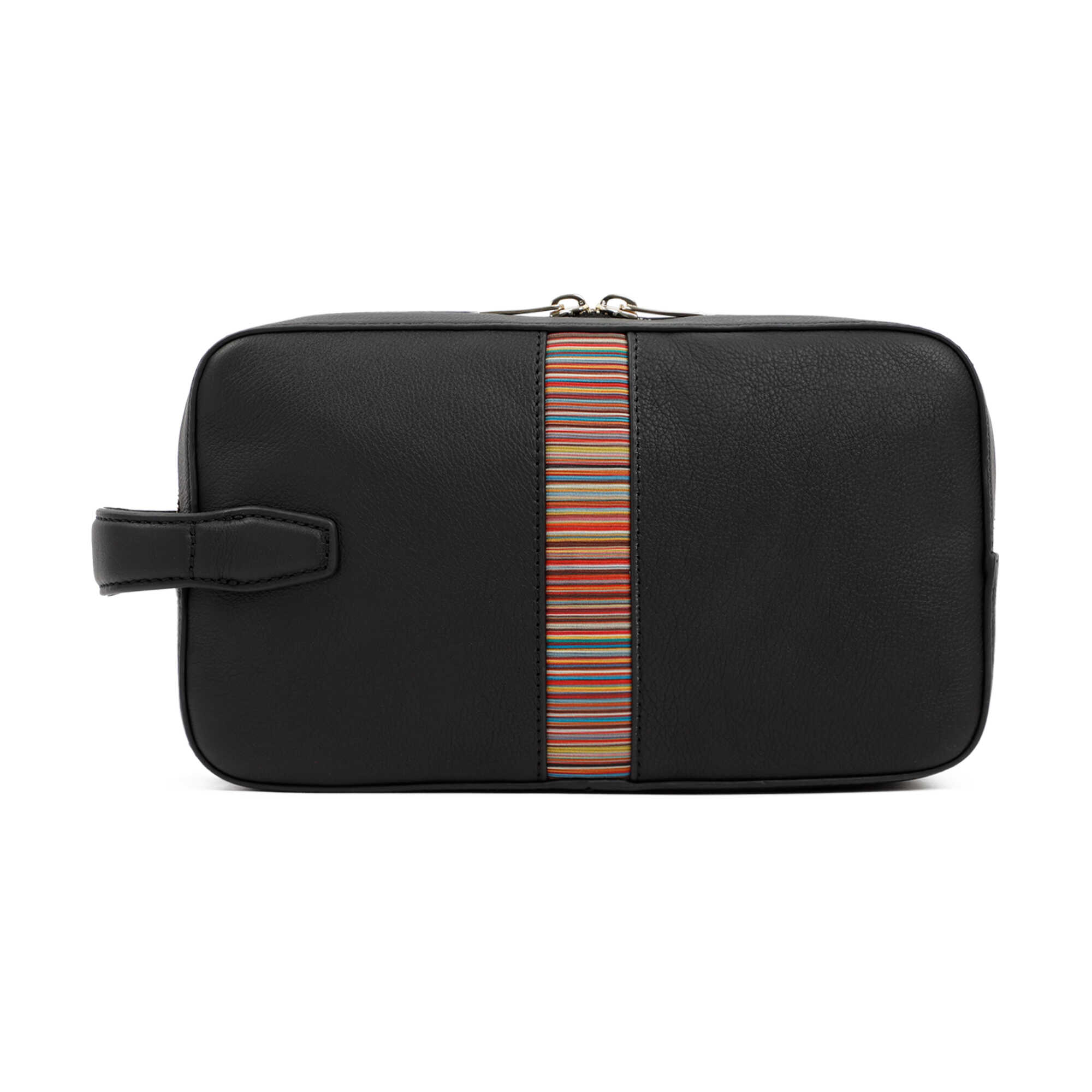 Elevate your style with this sleek black leather washbag from PAUL SMITH. Featuring a top zip fastening, signature stripe embellishment, and fully lined interior, this beauty case is both practical and stylish. With dimensions of W:23.5cm, H:14cm, D:10cm, it is the perfect accessory for the modern man on the go.