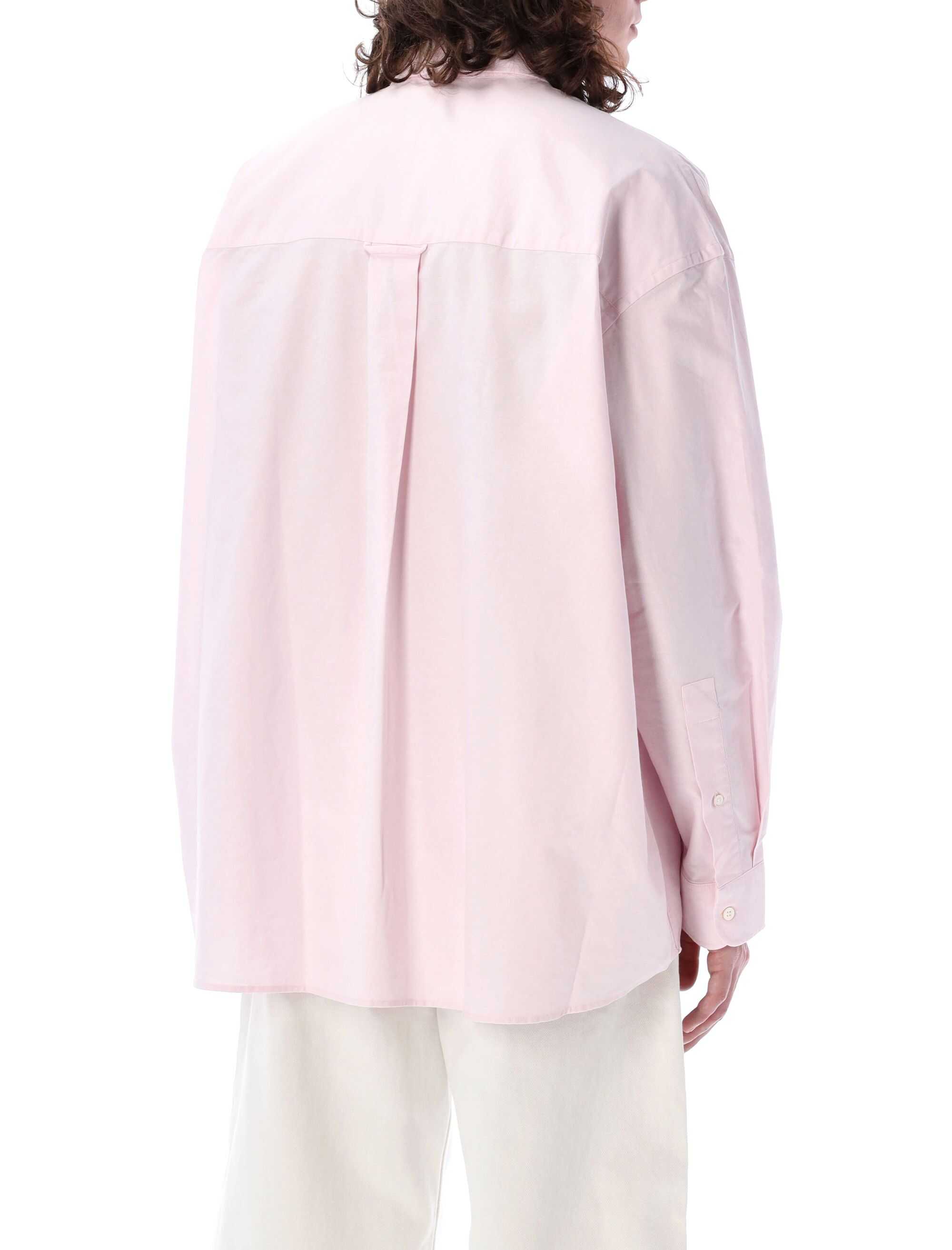 Elevate your style with the Ruskin shirt in Miami Pink by Studio Nicholson. This shirt features an oversized fit, button down collar, and front buttoned closure for a modern look. Made from 100% cotton, this shirt is perfect for any occasion. Stand out with the unique tonal SN embroidery at the waist. Get yours now and experience the comfort and style of Studio Nicholson.