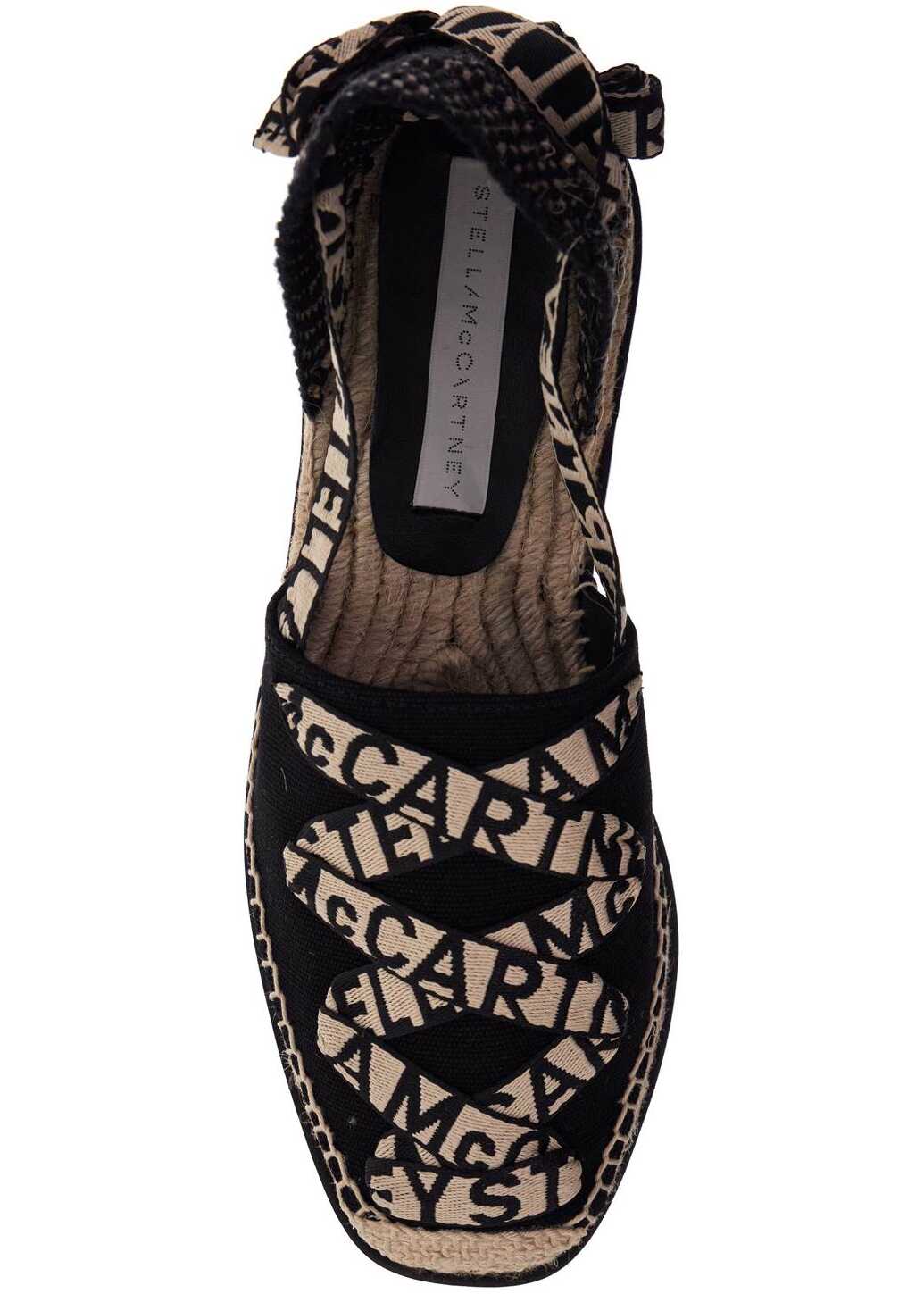 Stella McCartney Gaia espadrilles made of organic cotton featuring logoed ribbons to tie at the ankle and a notched rubber wedge sole.