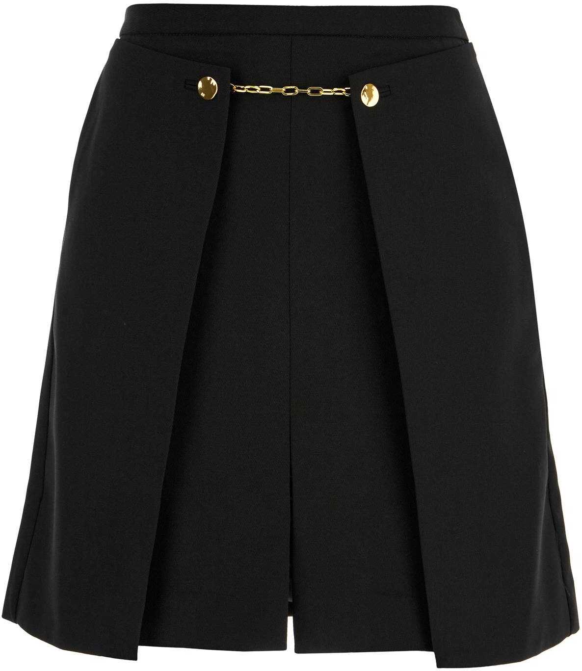 This Ganni skirt is made of technical twill and features two front panels that create a pleated effect. It has a front slit, decorative gold chain, and side closure with a hidden zipper. The fit is regular. The model is 177 cm tall and wears an EU size 34.