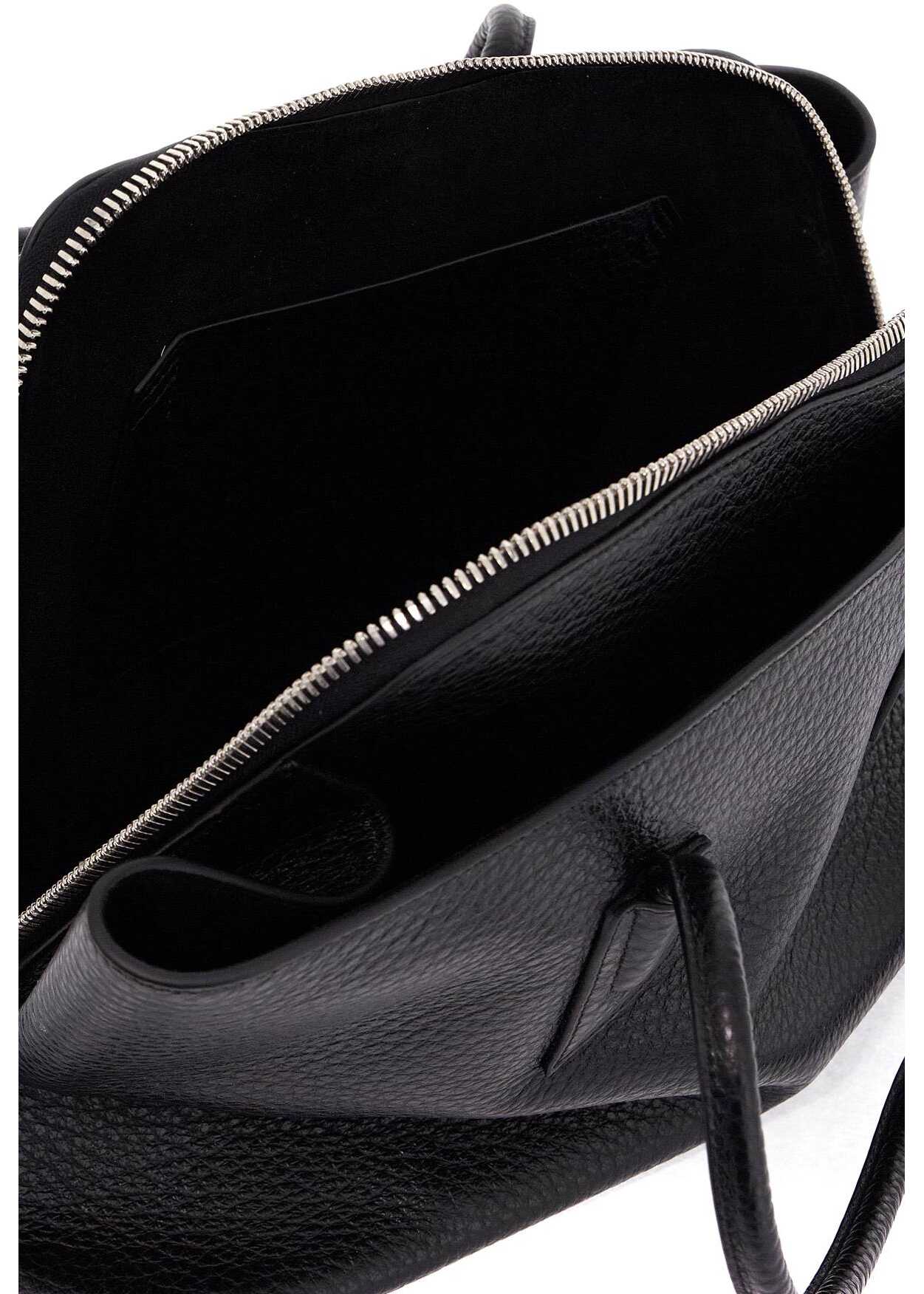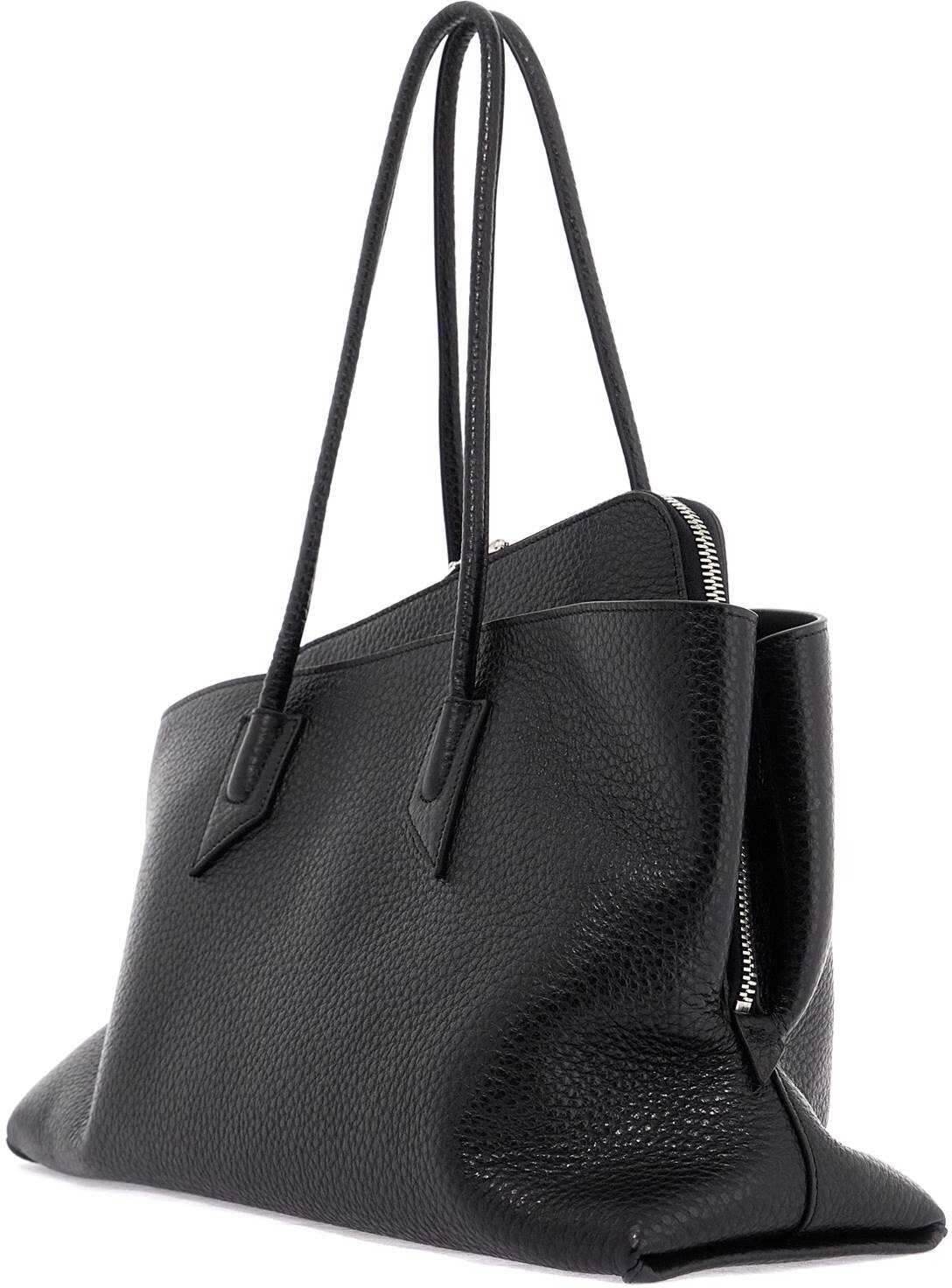 The Attico's La Passeggiata shoulder bag is made of hammered leather and features a soft, asymmetrical exterior structure completed by the main compartment inspired by the design of the Day Off clutch. It has a two-way zip closure, an unlined interior with an open pocket, tubular handles, and triangular protective feet at the base.