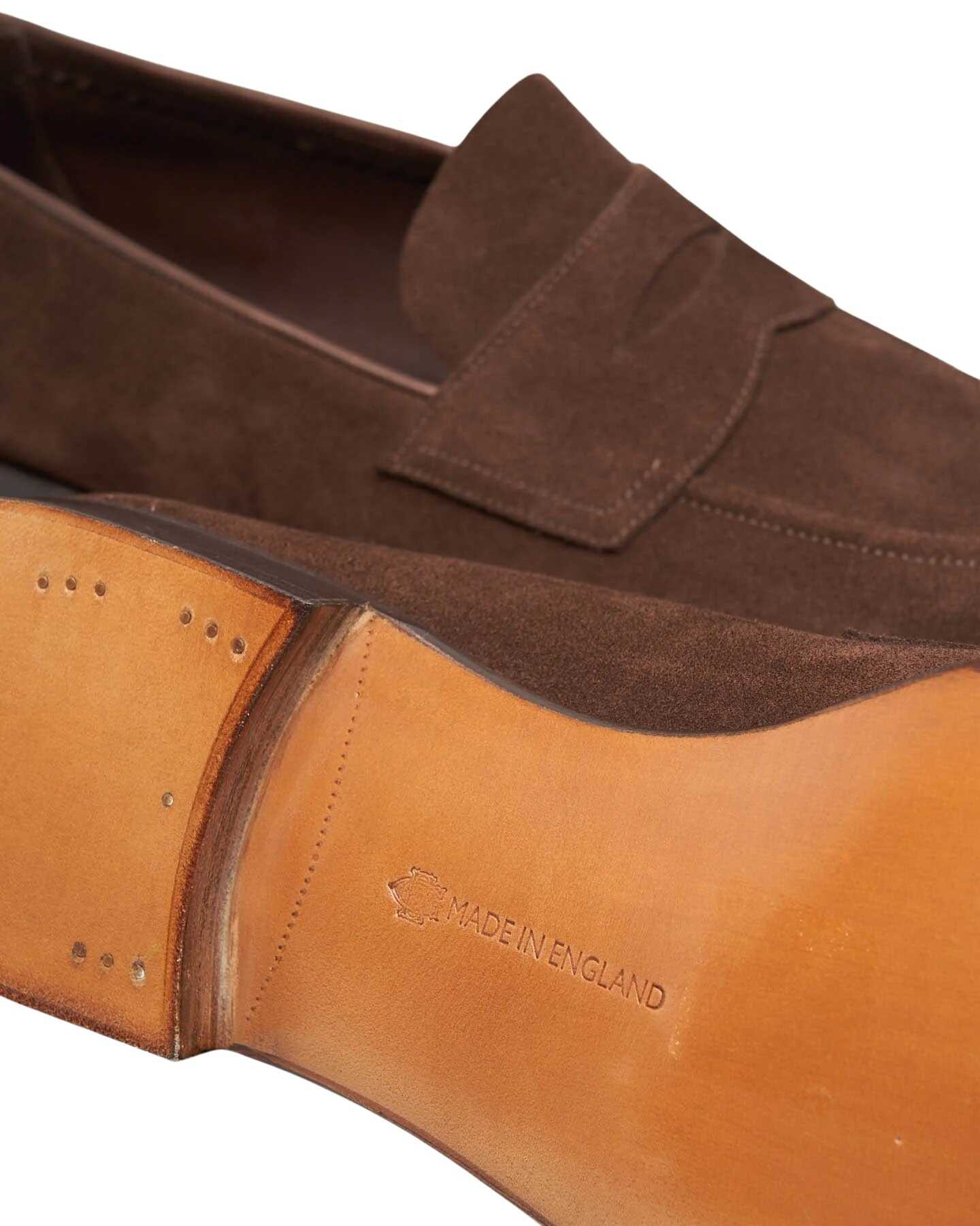 Edward Green unlined college loafer in brown suede, completely hand-stitched, round toe, leather sole, fitting E last 184.