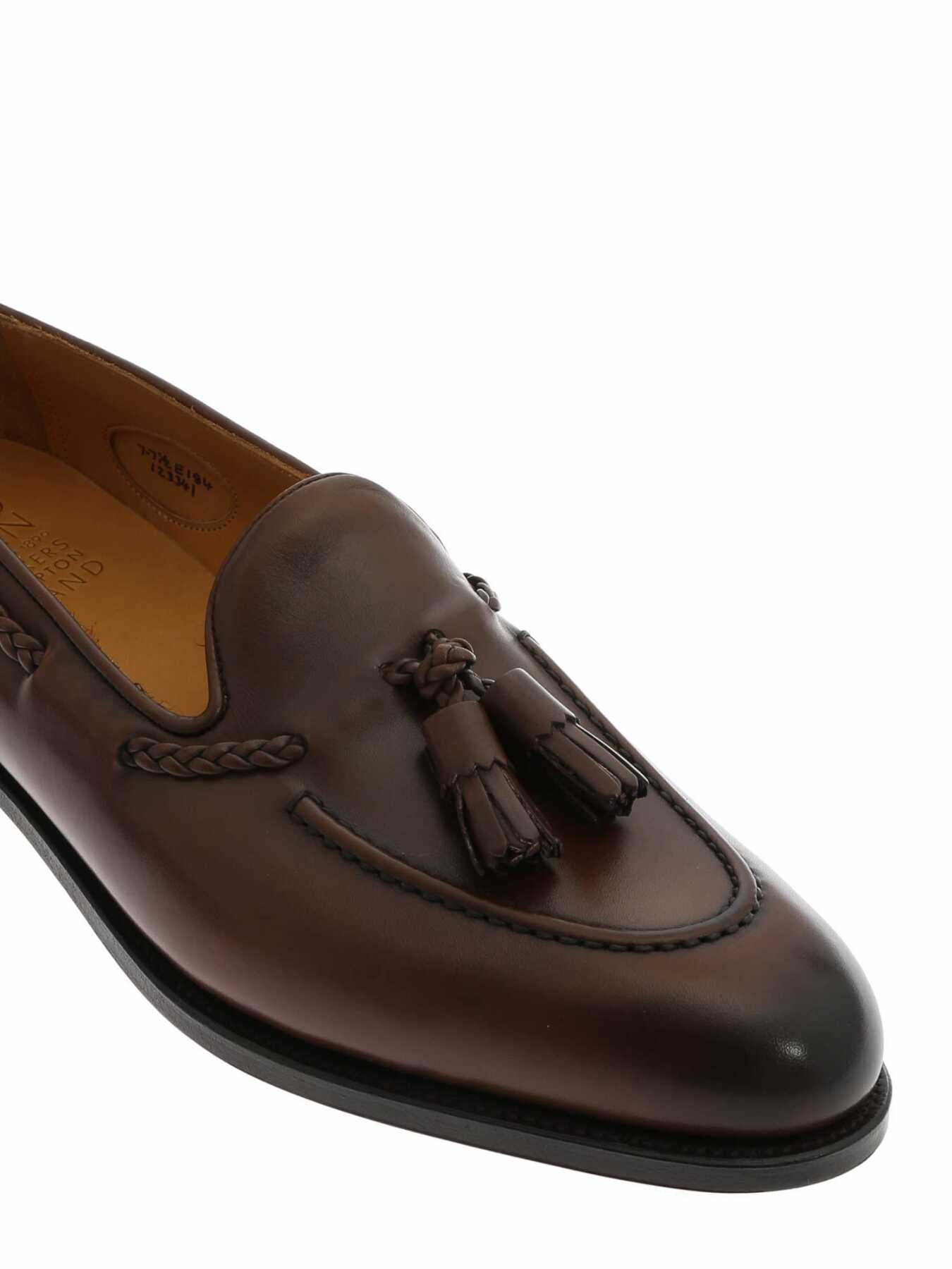 Edward Green moccasin in brown leather, tassels on the front, detail in woven leather, entirely hand-stitched, round toe, leather sole, fitting E last 184.