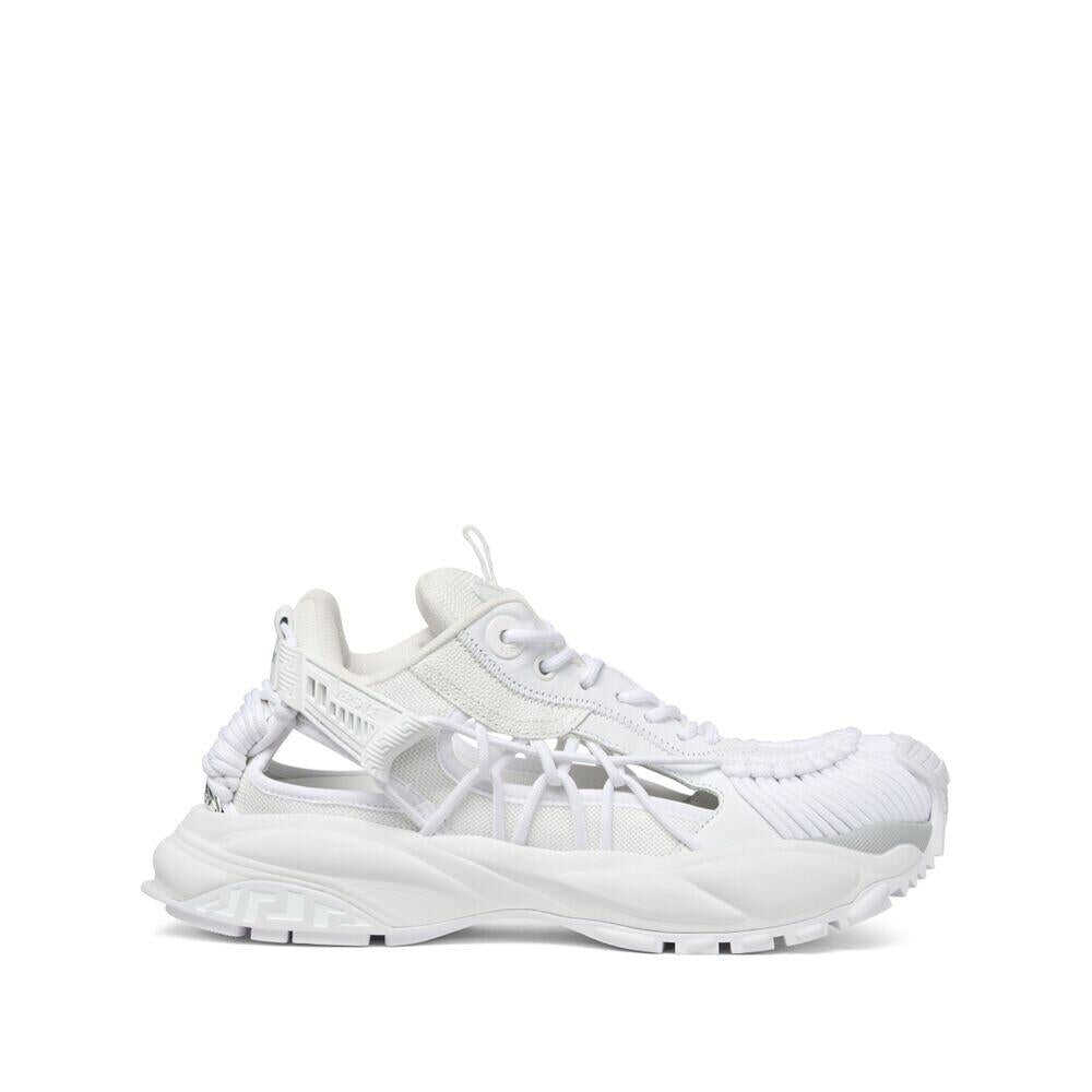 White panelled design cut-out detailing lace-up detailing logo print to the side appliqué logo signature greca detailing embossed detail round toe front lace-up fastening pull-tab at the tongue branded heel counter branded leather insole chunky rubber sole