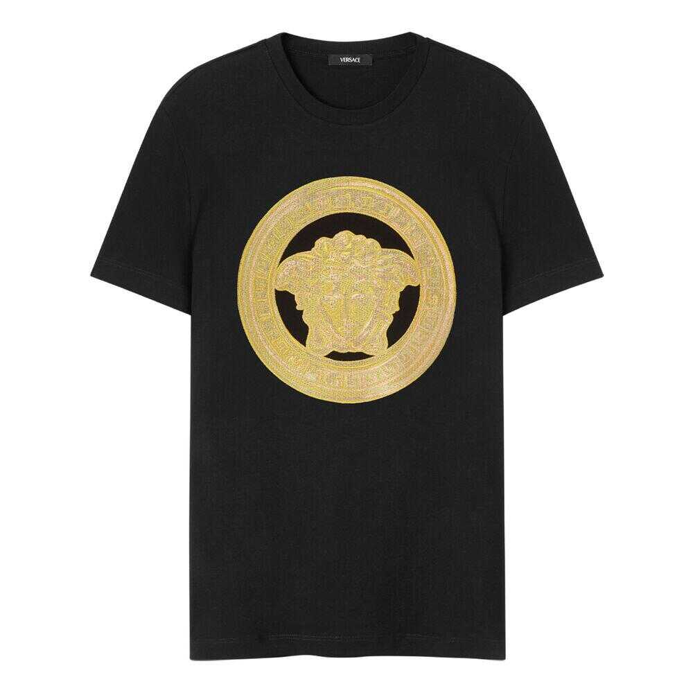 Black cotton jersey texture crew neck graphic print to the front medusa head motif short sleeves straight hem