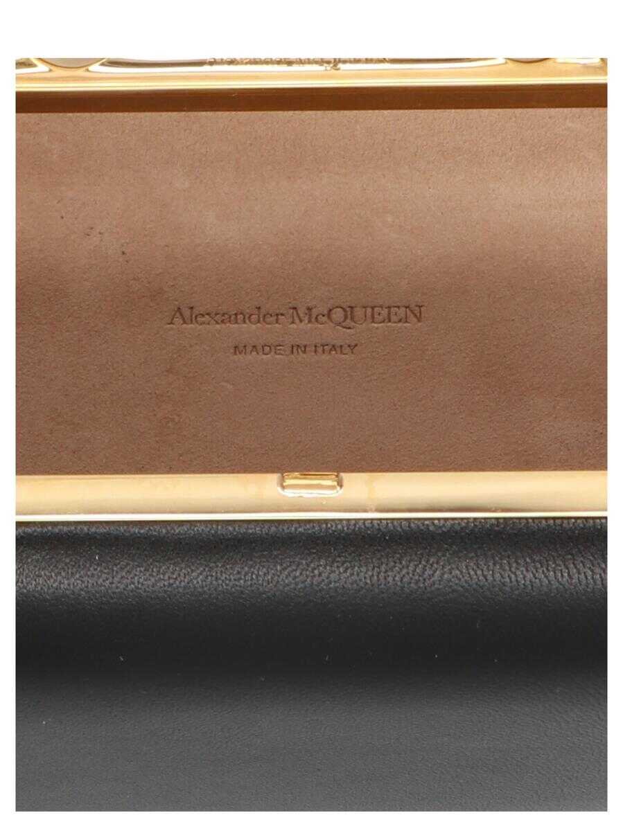 'Skull Four Ring' black nappa leather clutch featuring a skull and a handle with four antiqued gold finish rings with Swarovski crystals, a removable chain shoulder strap and metal brass accessories with an antiqued gold finish