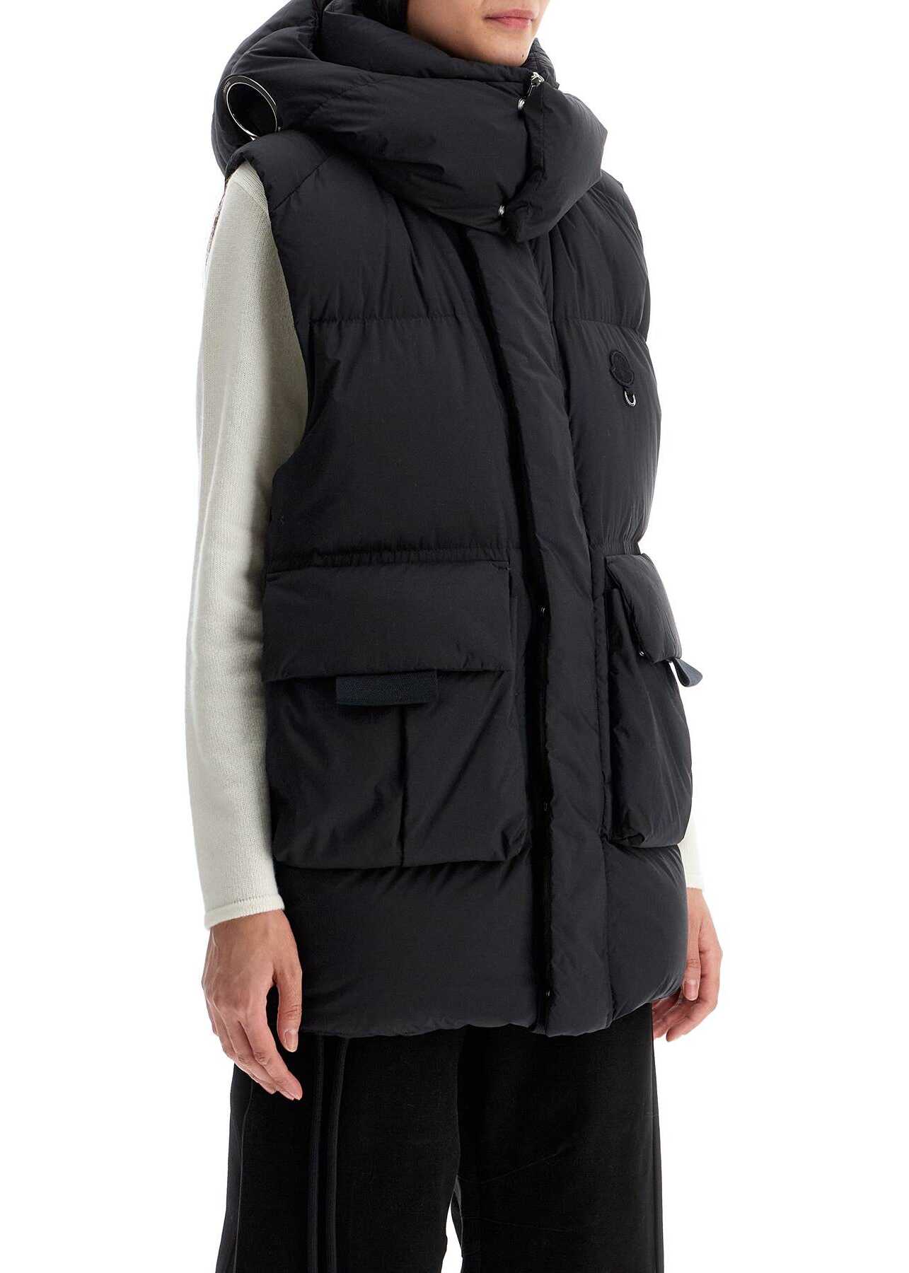The Moncler x Willow Smith quilted vest is made of lightweight matte nylon with goose down padding. It features a wide and elongated cut with a high collar and a detachable hood decorated with metal eyelets. Equipped with spacious double-entry pockets, the garment is completed by a zip and hidden snap button closure, adjustable drawstring hem, and collaboration logo applied on the chest. The model is 177 cm tall and wears size 0.