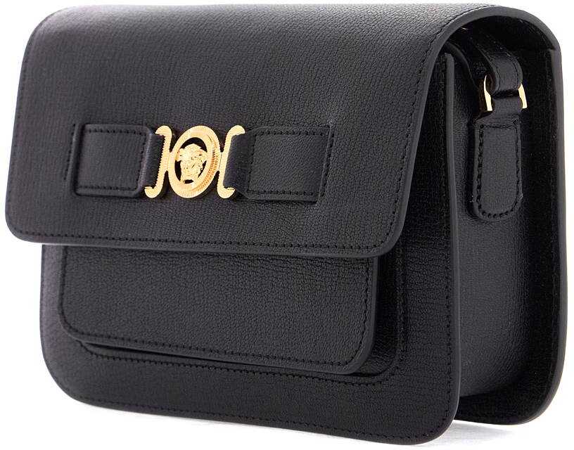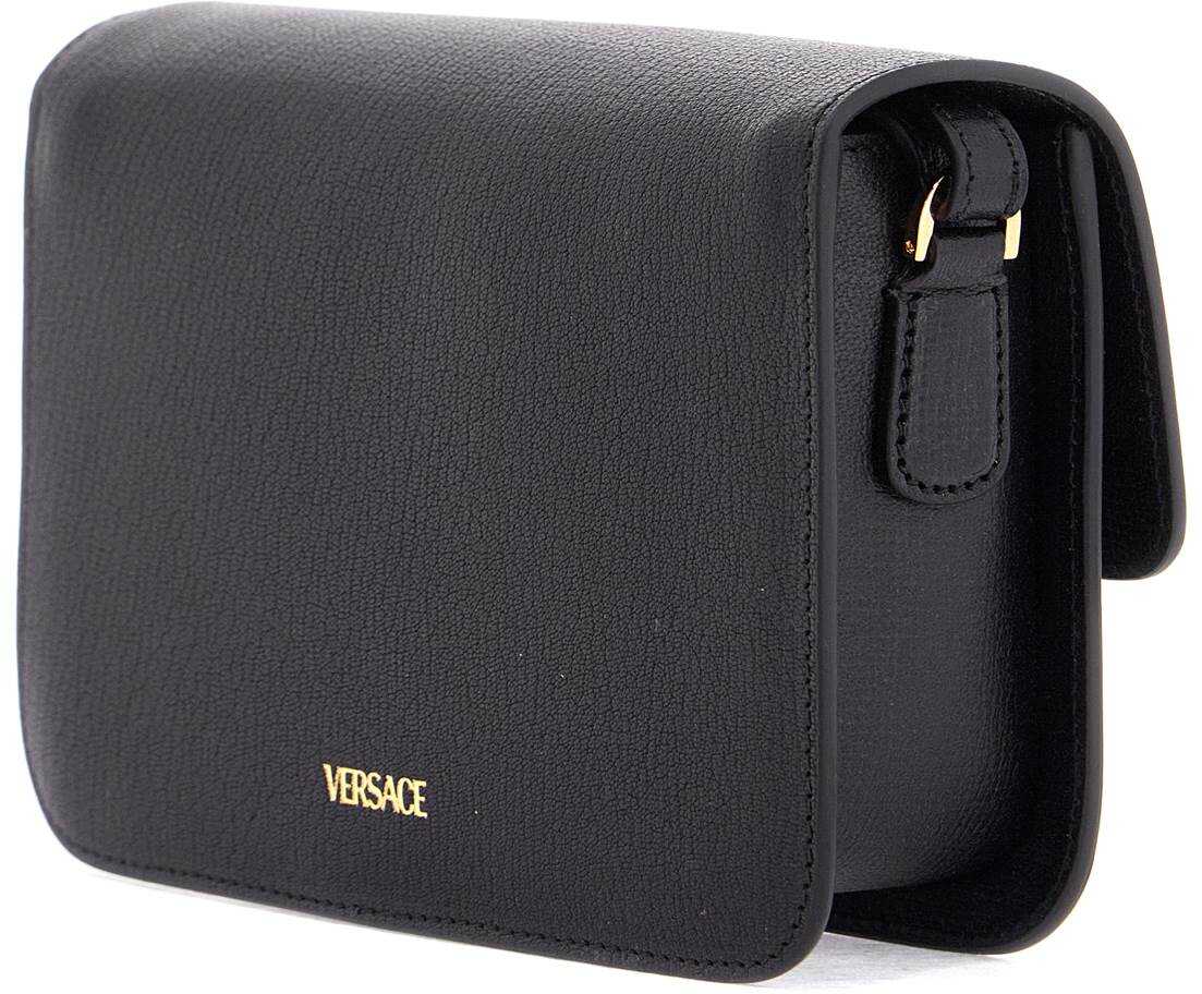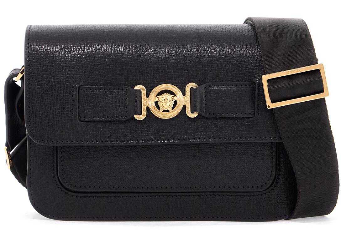 The Versace messenger bag is made of textured leather and adorned with the iconic Medusa Biggie accessory on the flap. It features a snap button closure, a front gusset pocket, and a main compartment lined in fabric with an open pocket and three credit card slots. The design is completed by an adjustable ribbon shoulder strap. The metal hardware has a gold finish.