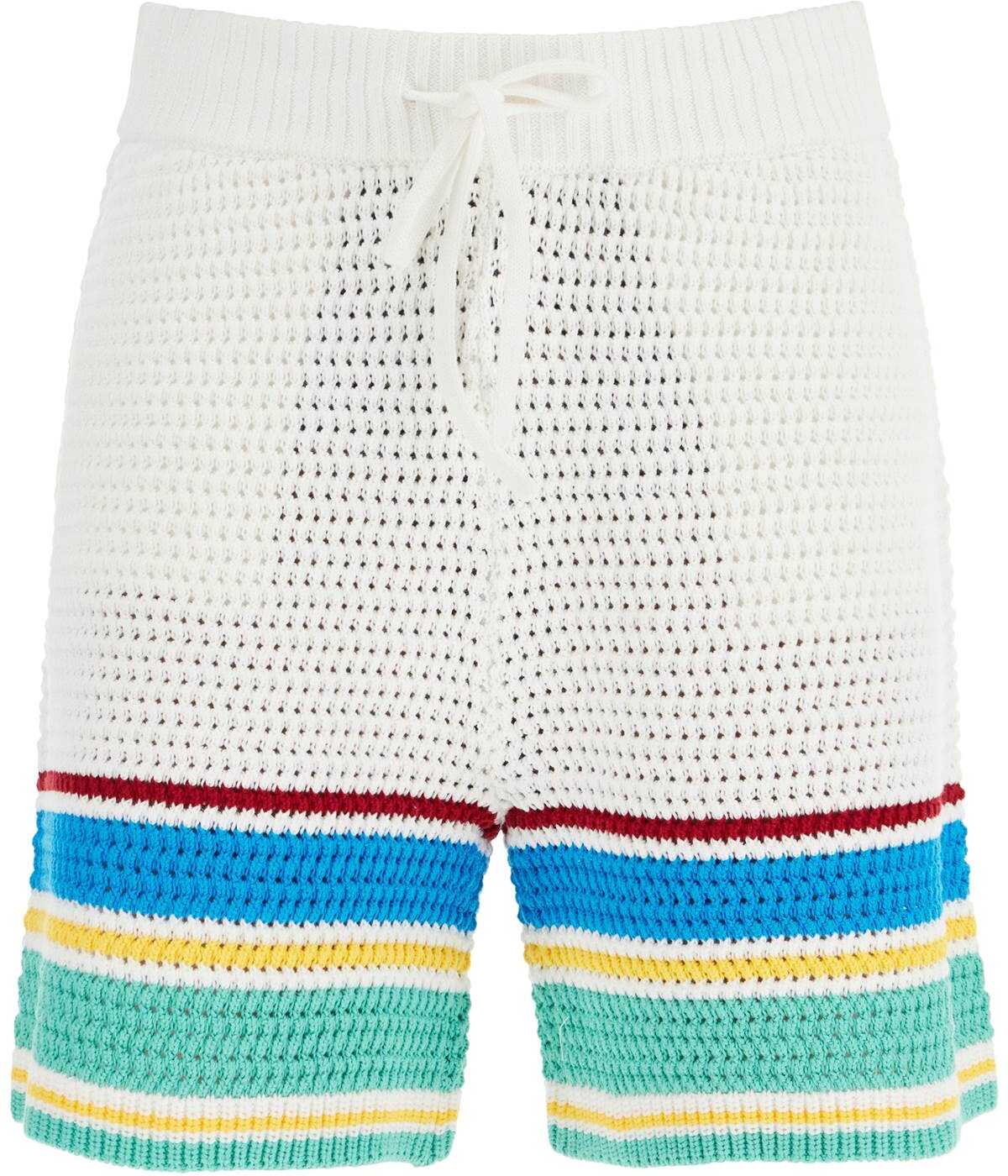 Casablanca Bermuda shorts made of striped crochet with a small logo patch applied on the left leg. They feature a medium elasticized waistband with drawstring, French pockets and a comfortable fit. The model is 182 cm tall and wears size M.