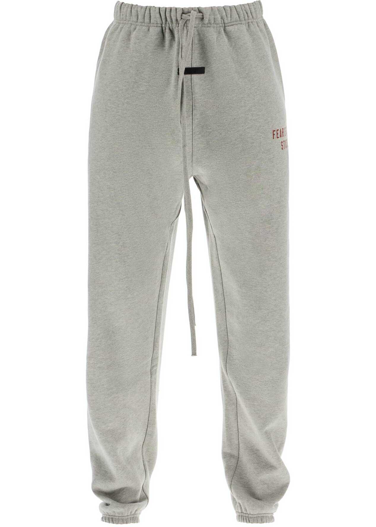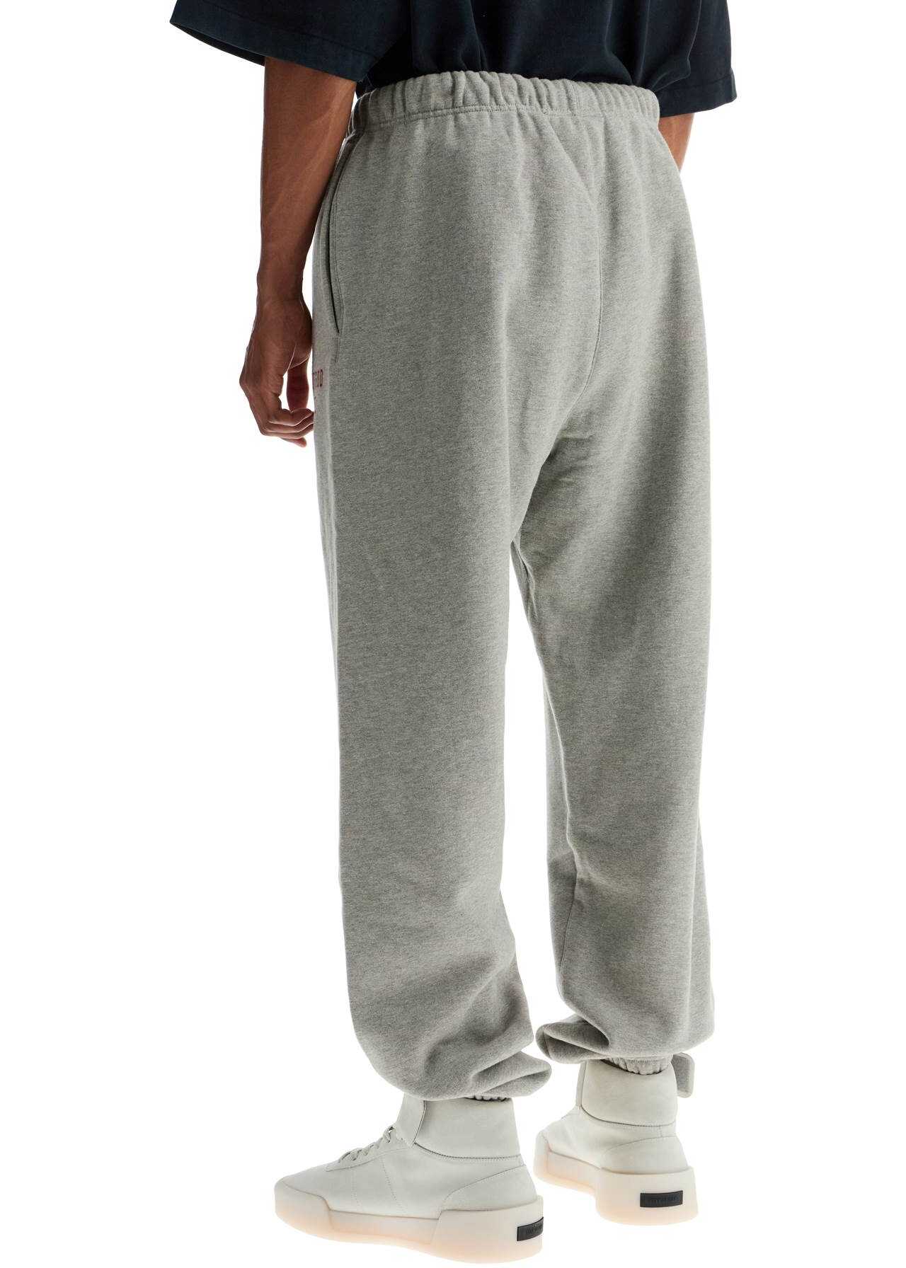 The Fear Of God Essentials sweatpants are made of a soft brushed cotton blend. They feature a relaxed fit with side seam pockets, an elastic waistband with drawstring, and elasticized cuffs. The logo is printed on the side, and there is a rubber label on the front. The model is 182 cm tall and wears size M.