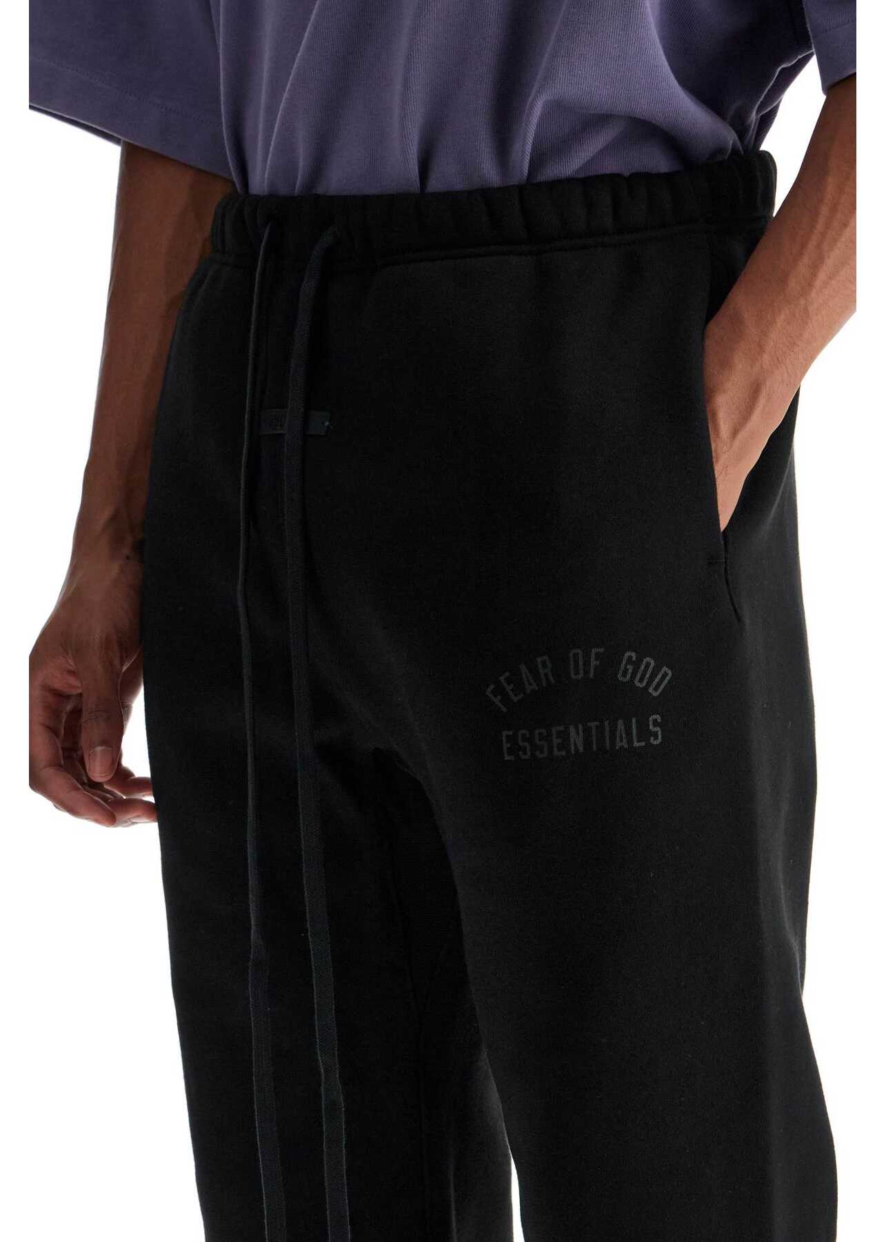 The Fear Of God Essentials sweatpants are made of a soft brushed cotton blend. They feature a relaxed fit with side seam pockets, an elastic waistband with drawstring, and elasticized cuffs. The logo is printed on the side, and there is a rubber label on the front. The model is 182 cm tall and wears size M.