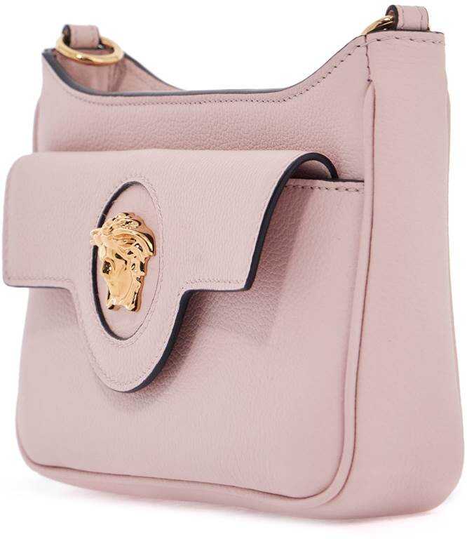 This mini Versace bag is made of hammered leather and decorated with a golden metal Medusa detail on the front pocket flap. It features a main zip closure, a lined interior with an open pocket, and comes with a removable chain handle and an adjustable and removable leather shoulder strap.
