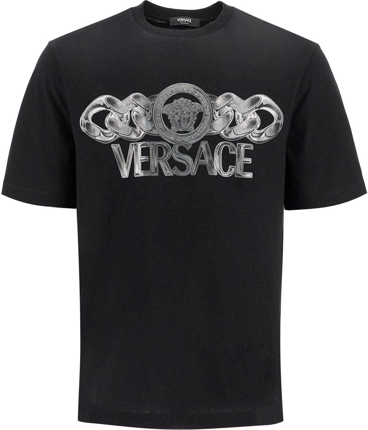 This Versace crew neck t-shirt is made of cotton jersey and features a metallic graphic print 'Medusa On Chain'. It has a regular fit. The model is 182 cm tall and wears size M.
