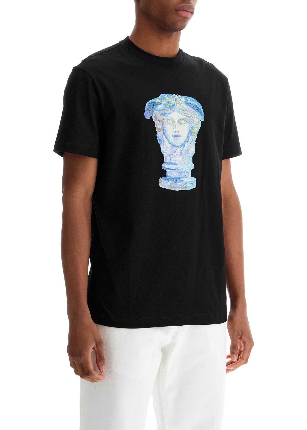 This Versace crew neck t-shirt is made of cotton jersey and enriched with the Medusa Gallery print and embroidery. It has a slim fit. The model is 182 cm tall and wears size M.