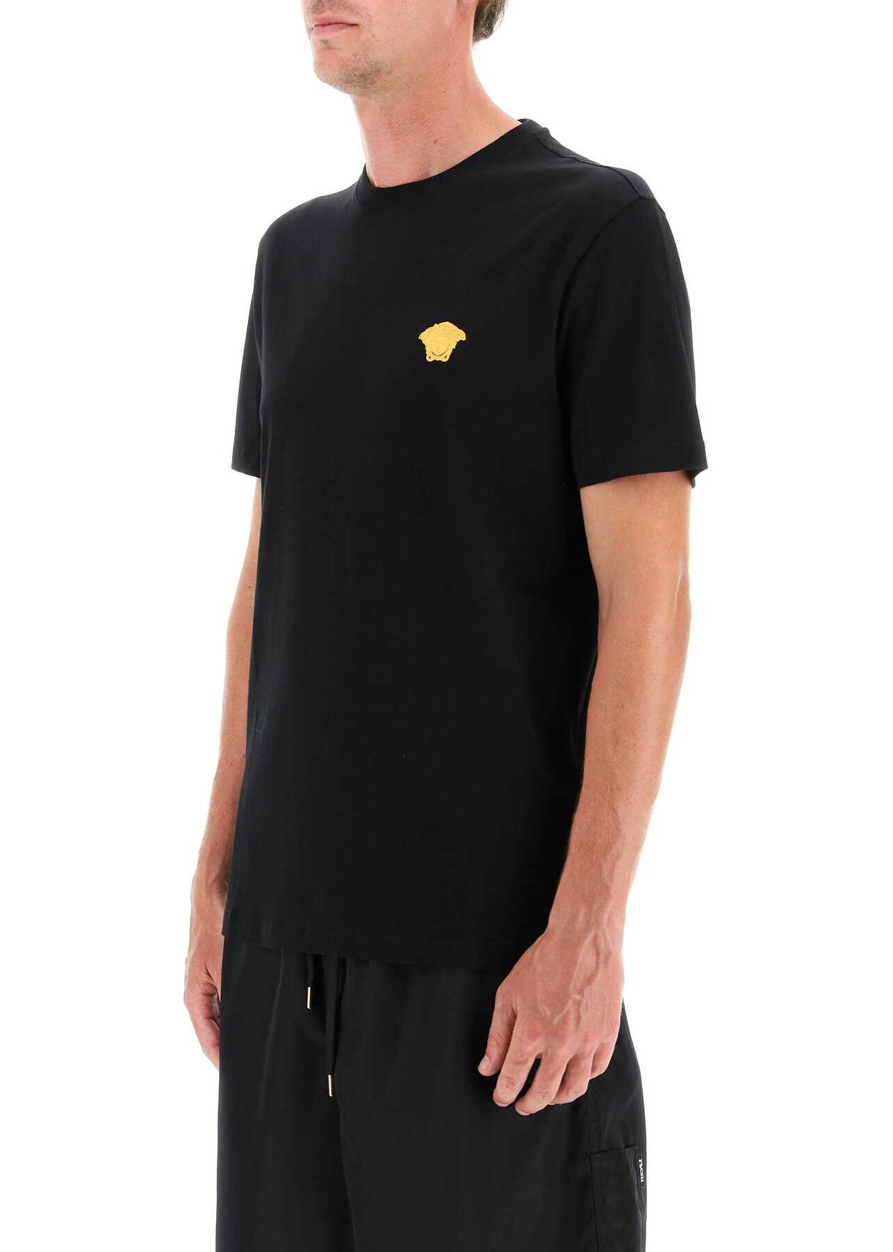 Versace cotton jersey T-shirt embroidered with a Medusa logo detail on the chest. Ribbed crew neck. The model is 187 cm tall and wears a size M.