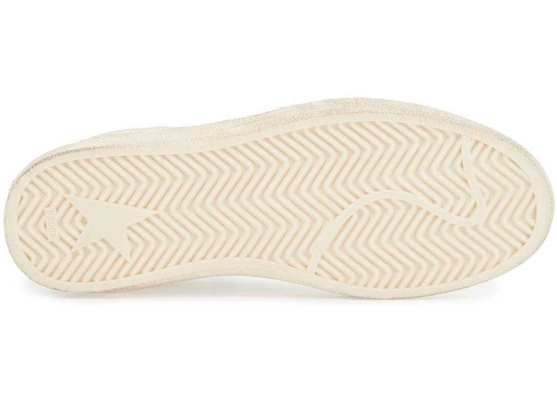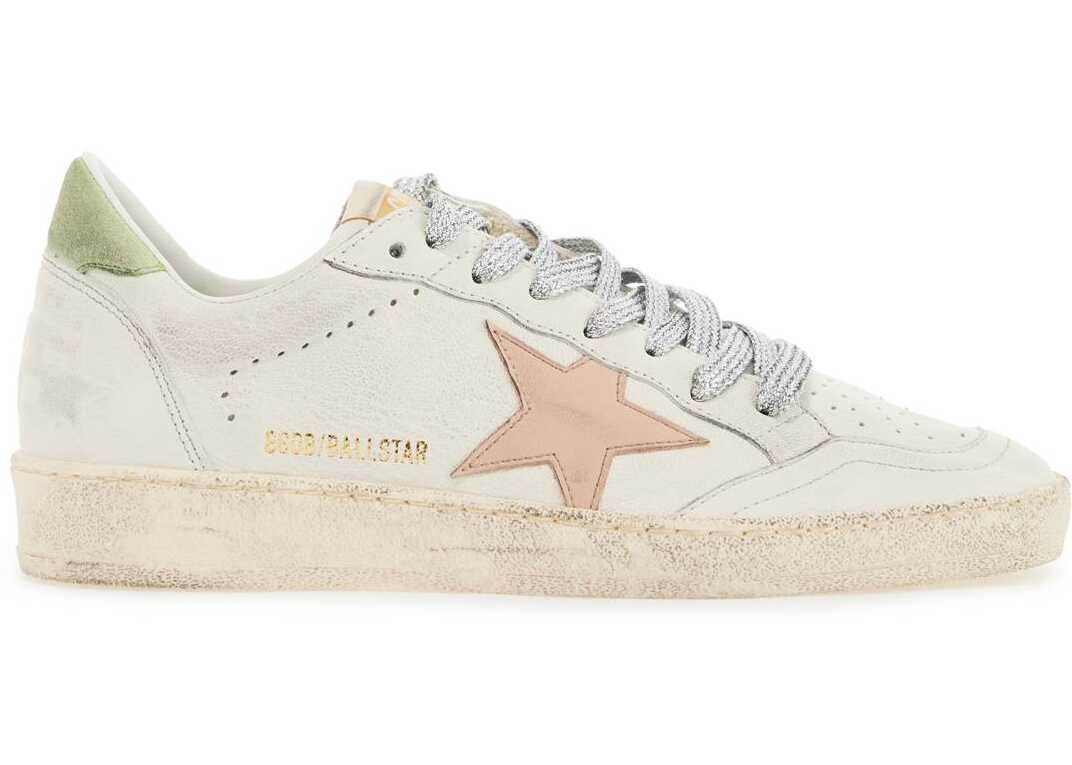 The Golden Goose Ball Star Sneaker is made of used-effect nappa leather with a smooth leather side star and suede spoiler, both in contrasting colors. It features perforations on the toe and sides, laminated lettering on the side, lurex laces, a logo label on the tongue, and 'SNEAKERS' lettering imprinted on the heel. The interior is lined with sponge and has a removable leather insole, while the sole is made of rubber.