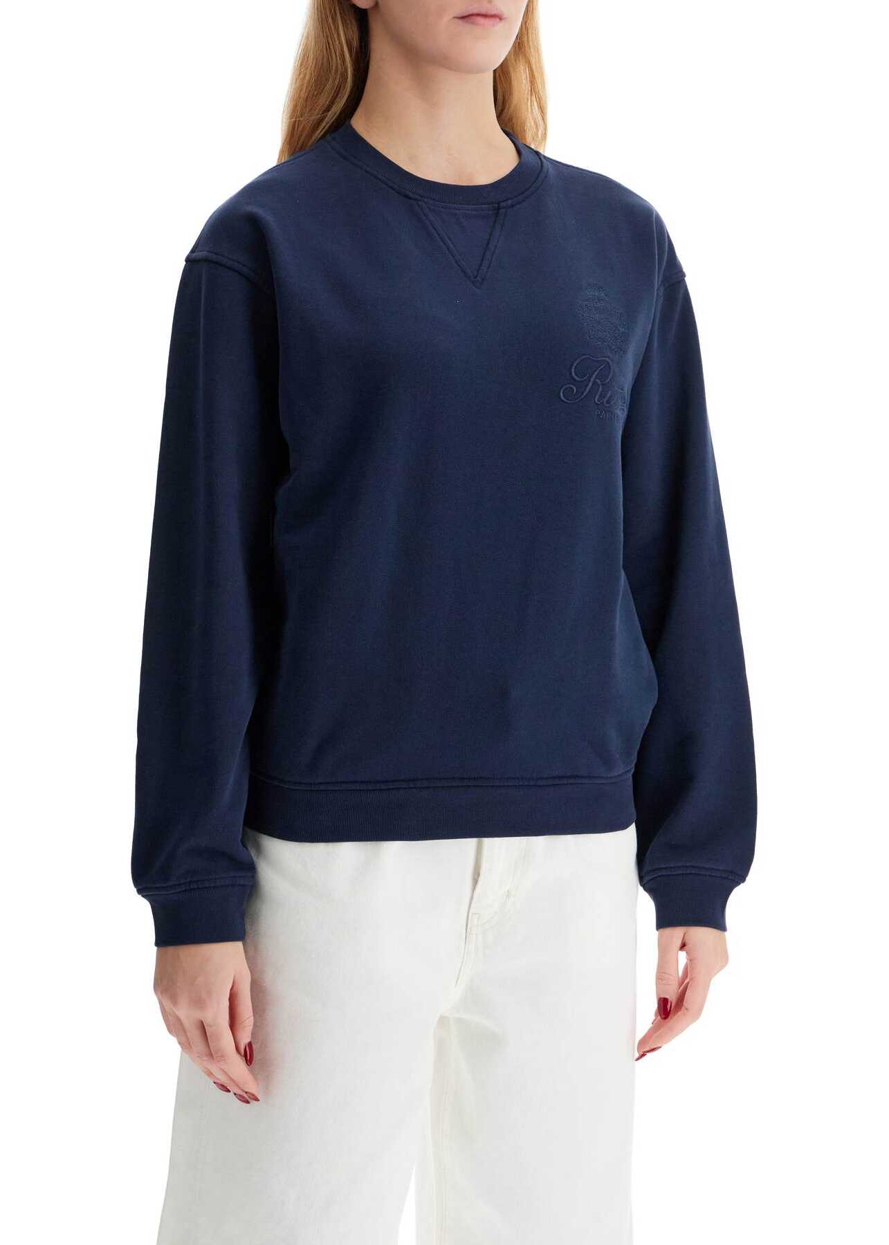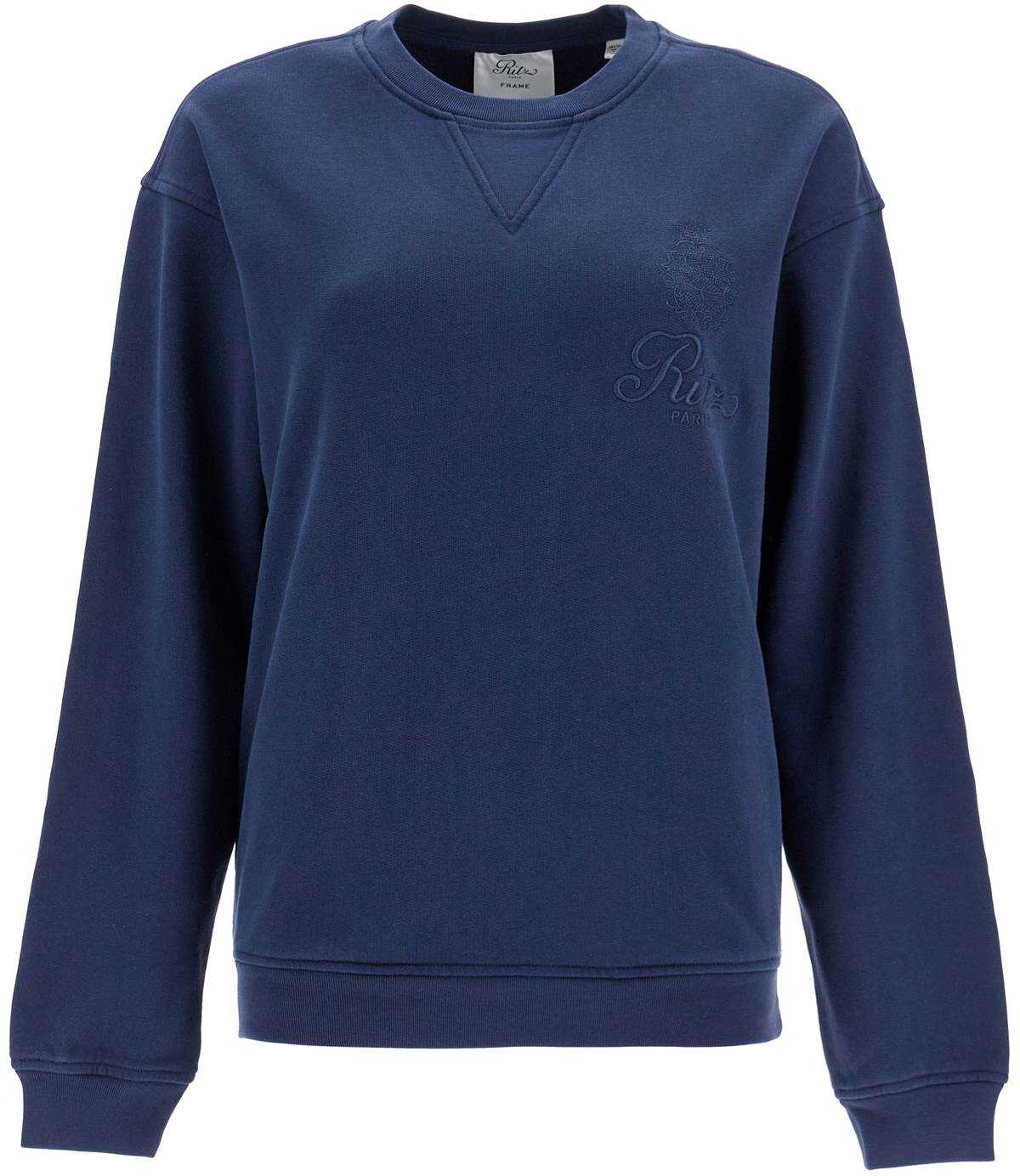 This crewneck sweatshirt from the Frame x Ritz Paris capsule collection is made of soft cotton jersey and features tonal embroidery of the Ritz Paris logo on the chest and the Frame logo on the back of the neck. It has a relaxed fit with side pockets and ribbed edges. The model is 177 cm tall and is wearing size XS.