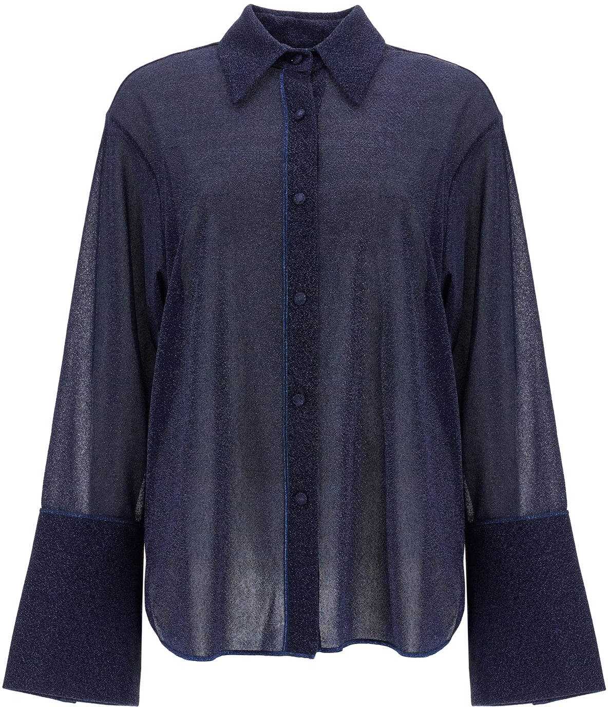 The Osé ree oversized shirt is made of lightweight jersey lurex, featuring maxi cuffs with five buttons. It has a classic pointed collar and buttons covered in the same fabric. The model is 177 cm tall and wears size S/M.