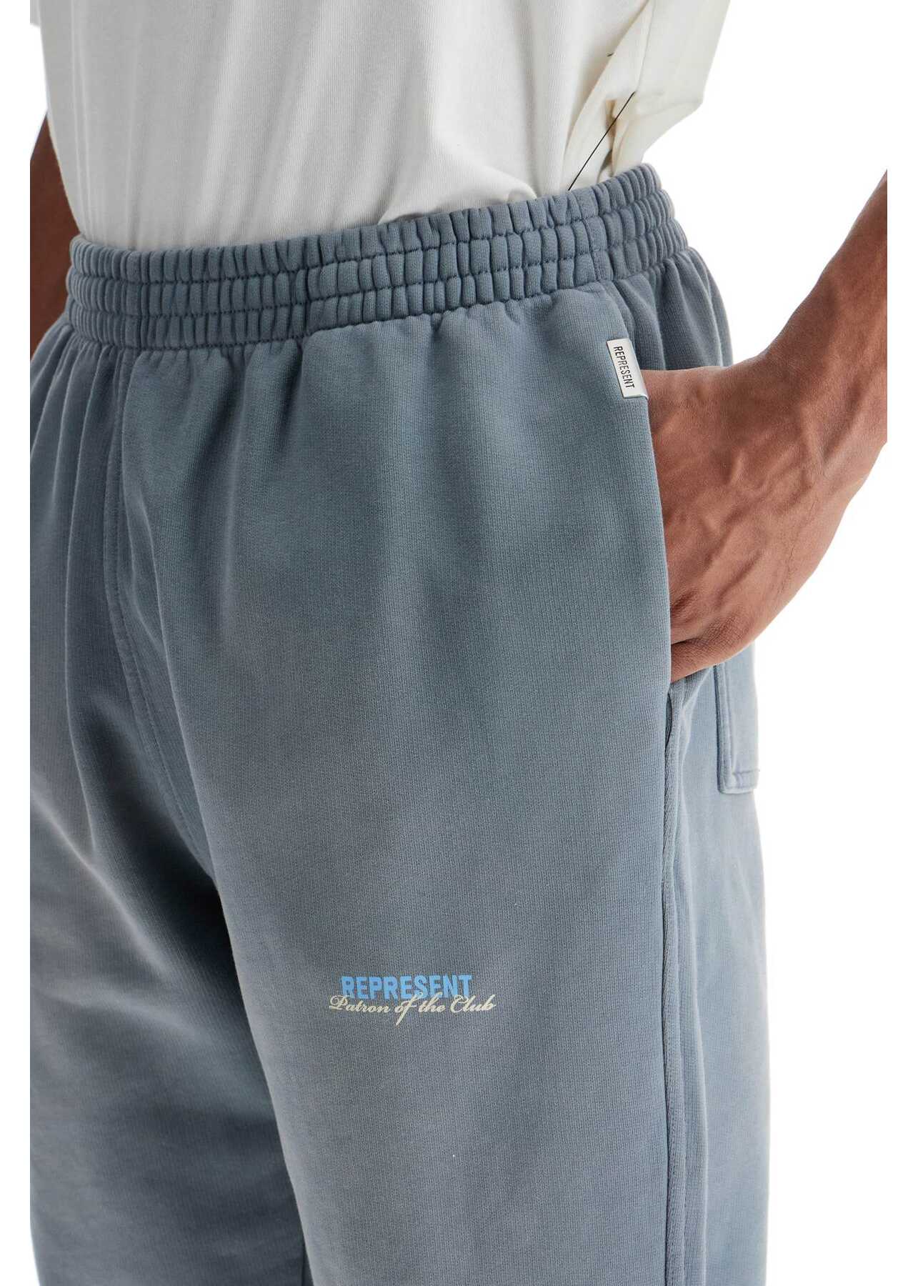 Sporty sweatpants made of brushed cotton, featuring a 'Patron of the Club' print detail on the front. They have two side pockets and two back pockets, with a relaxed fit and elasticated waistband and cuffs. The inner drawstring at the waist and metal logo tag on the left pocket add extra style. The model is 182 cm tall and wears size M.