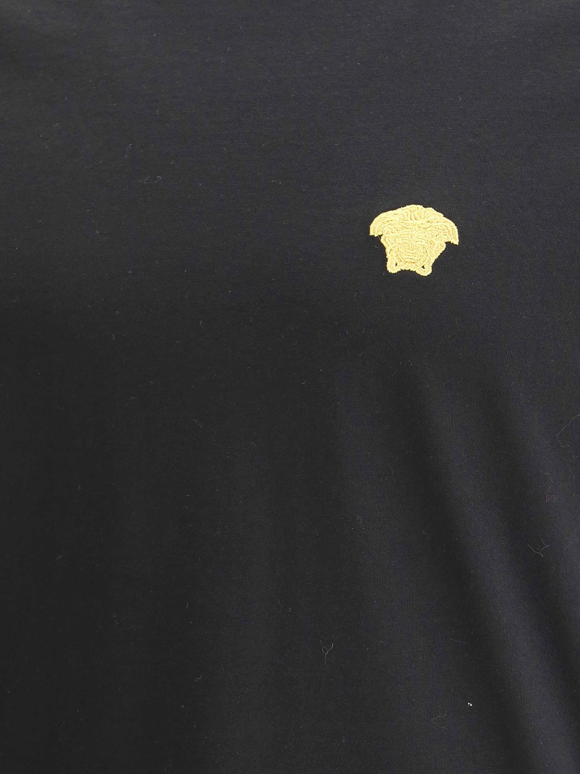 The cotton T-Shirt by Versace combines essential elegance and distinctive identity in a striking casual piece. Made of soft monochrome patterned cotton, it features a ribbed crew neck and a regular fit that ensures comfort and versatility. A contrasting patch with the iconic Medusa logo, a timeless symbol of the Maison, stands out on the front. A contemporary must-have, perfect to complete your daily wardrobe with a recognizable touch of luxury.