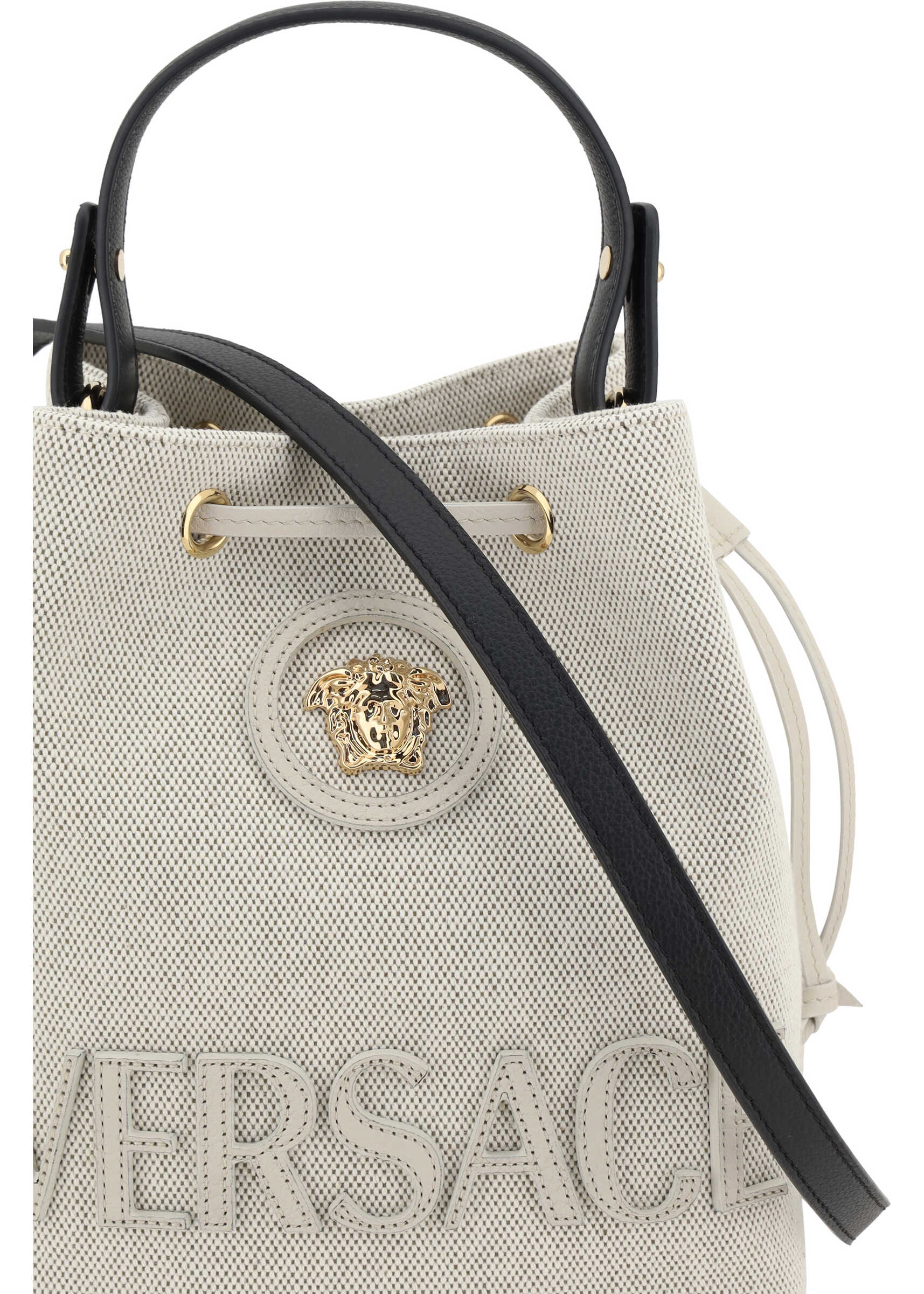 The La Medusa Bucket Bag combines iconic style with functionality. The top closure with adjustable drawstring ensures practicality, while the flat shoulder strap allows for comfortable carrying. The front features a stitched monogram and plaque with the iconic Medusa logo, immediate symbols of the brand. The interior consists of a single compartment, simple and essential.