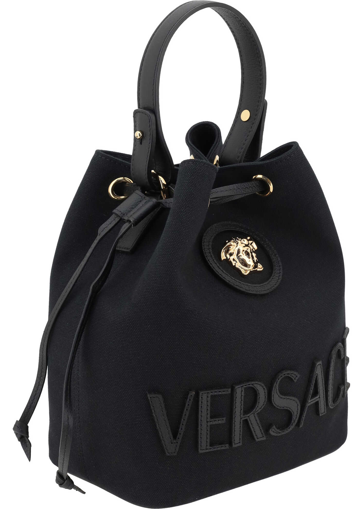 The La Medusa Bucket Bag by Versace combines elegance and boldness. The top closure with adjustable drawstring ensures practicality, while the flat shoulder strap allows for optimal comfort. The brand's iconic monogram is stitched on the front, complemented by the plaque with the iconic Medusa logo, Versace's signature symbol. Inside, a single compartment offers essential space for everyday items.