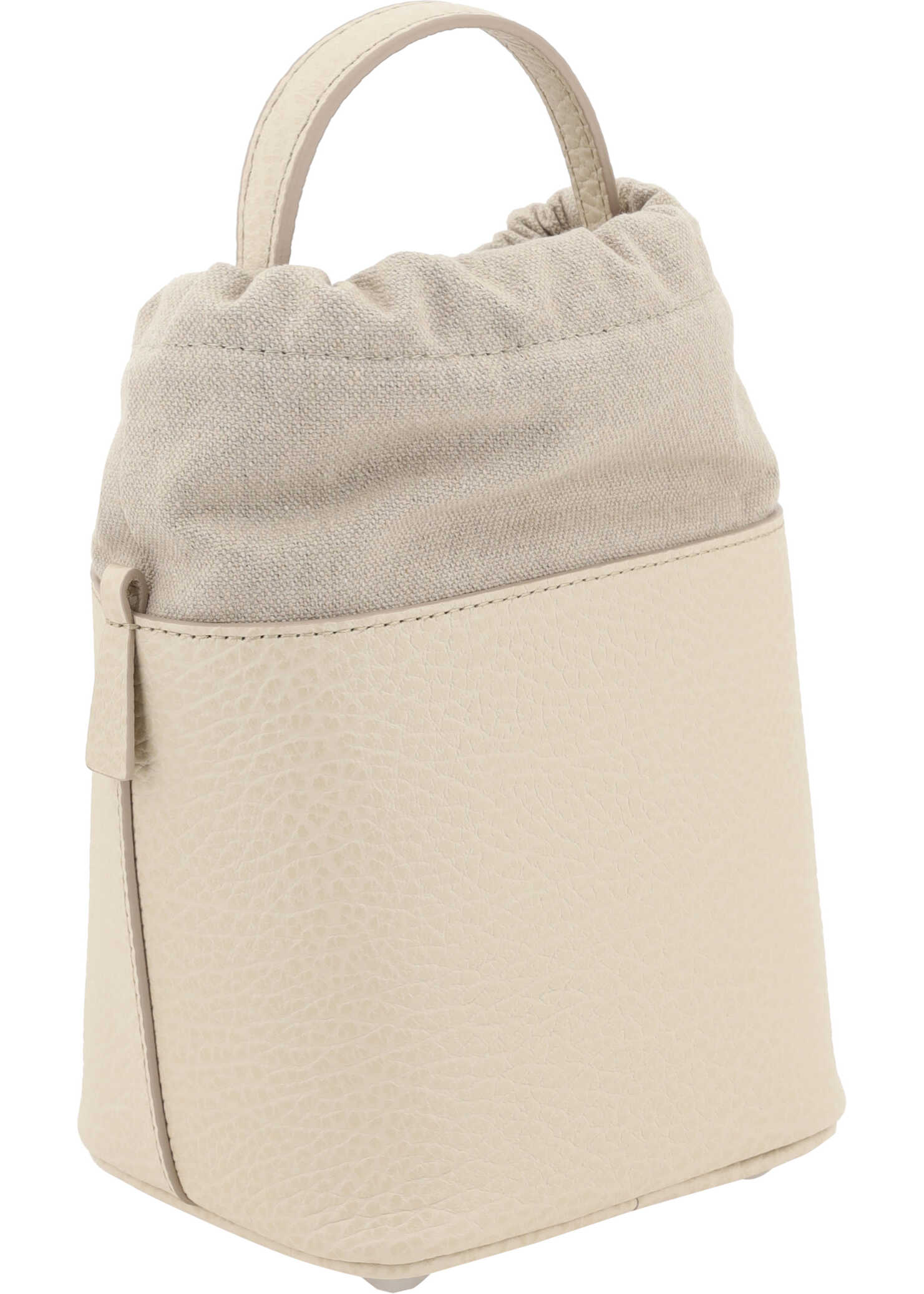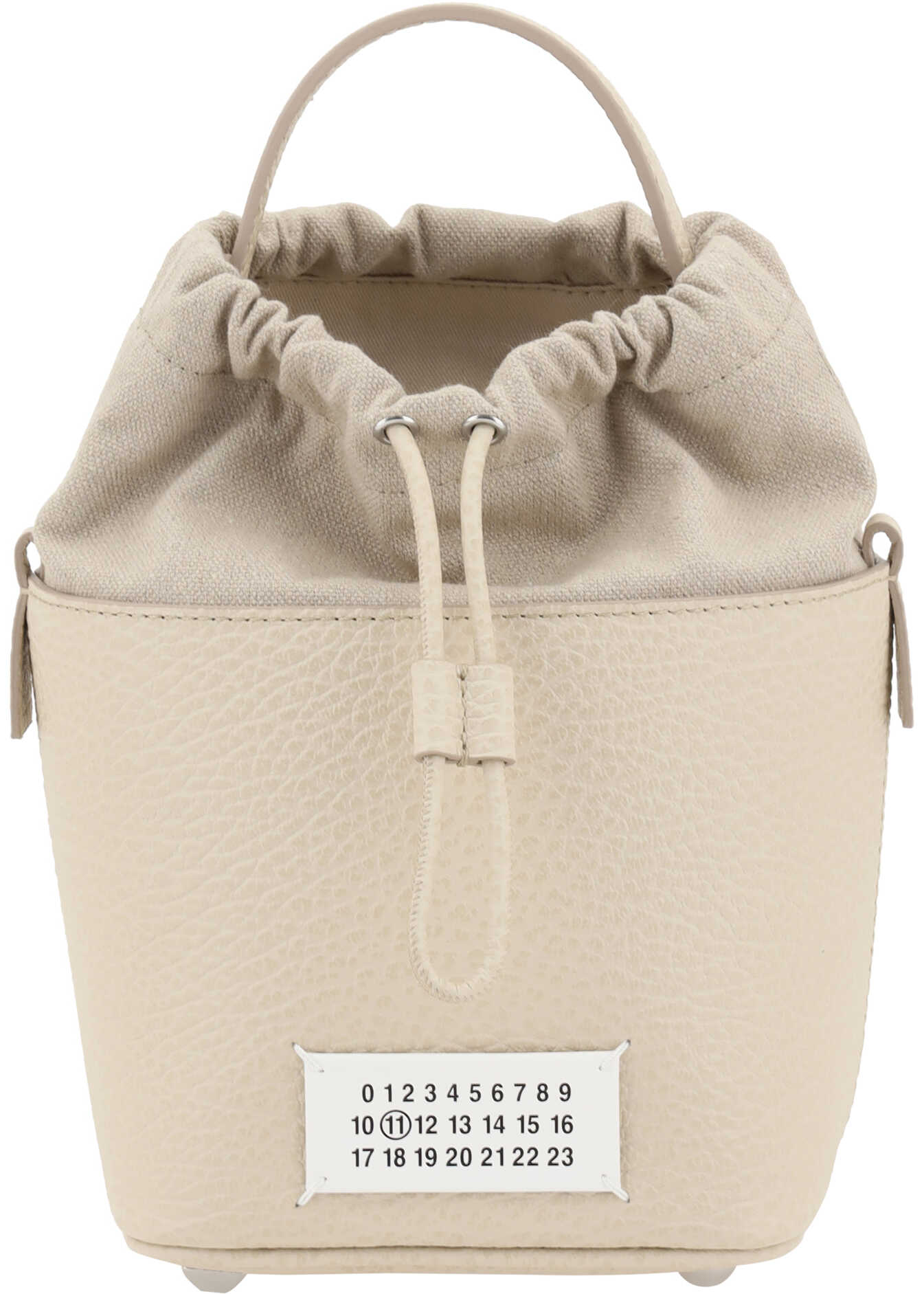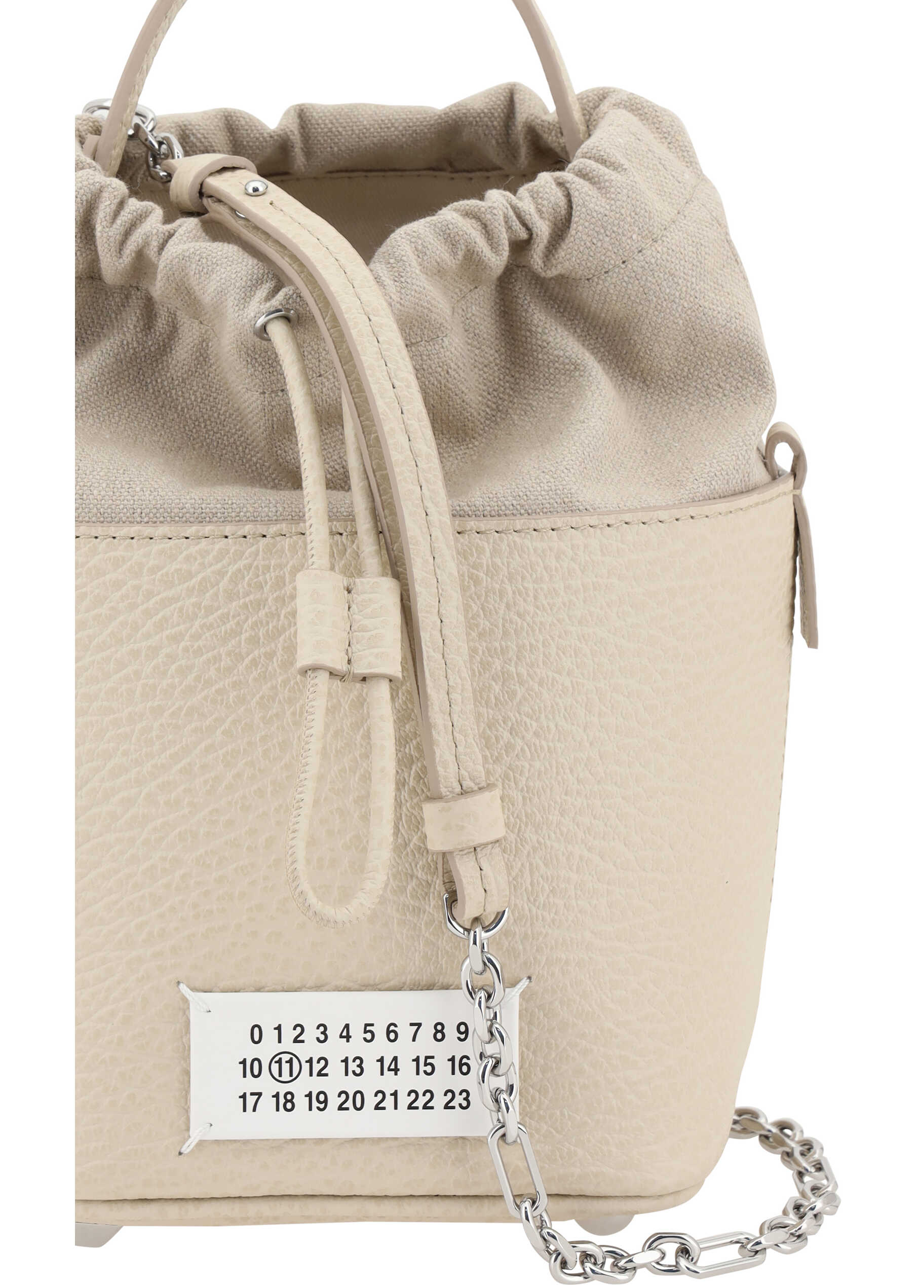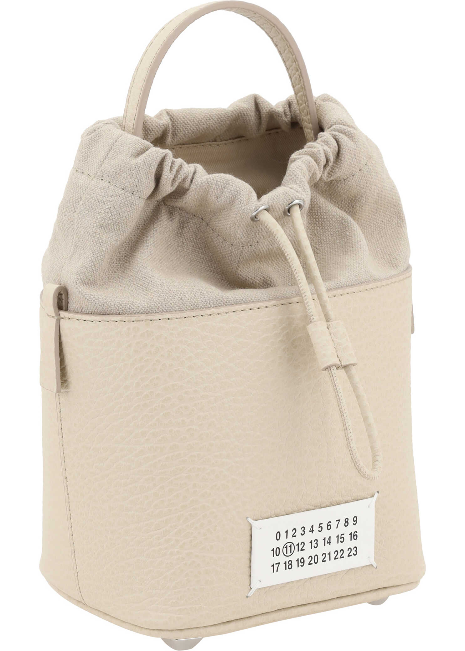 Calfskin Bucket Bag by Margiela, adjustable drawstring closure, top handle, removable chain shoulder strap, front logo tag, bottom purse feet, internal compartment.