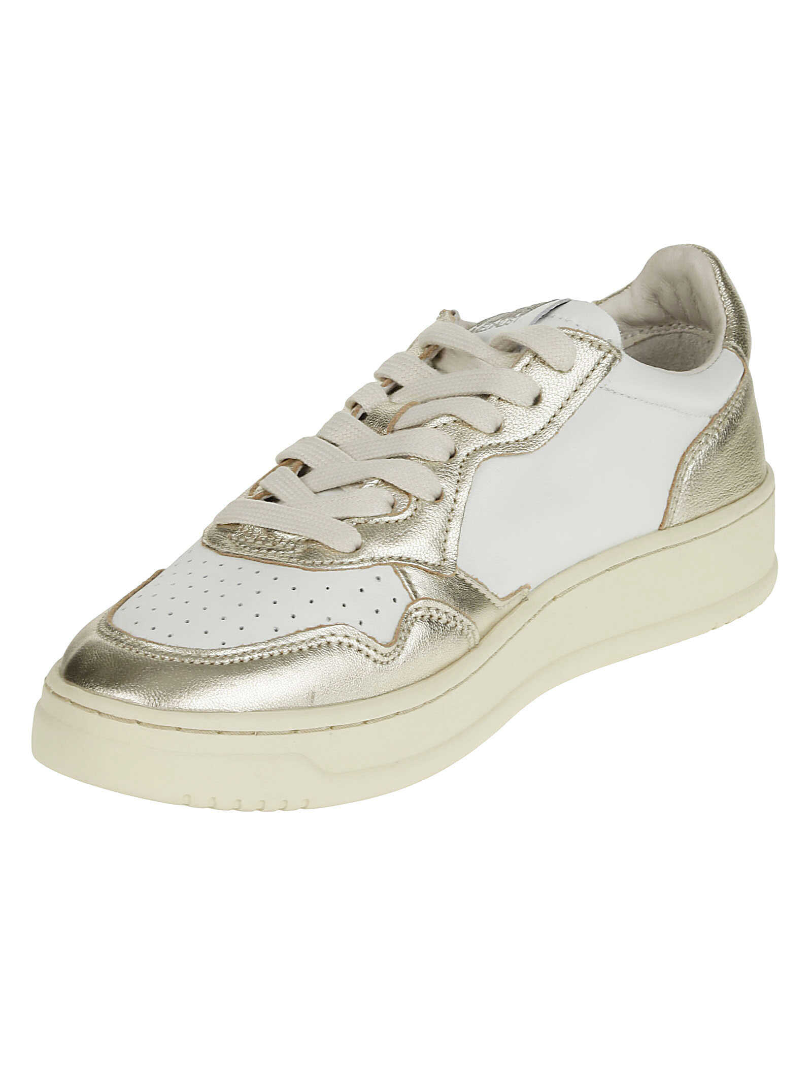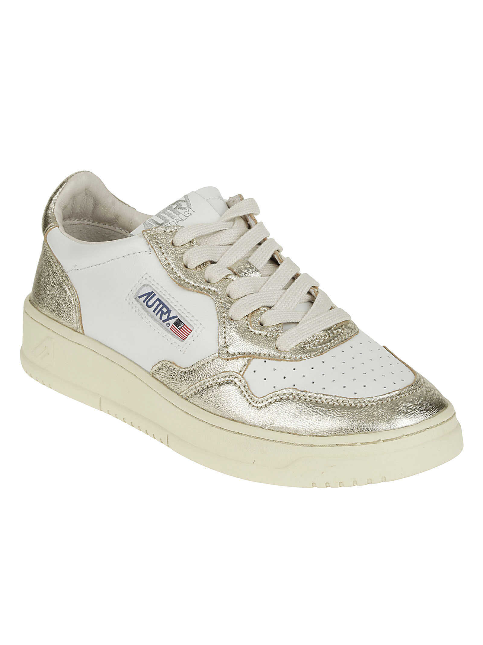 Autry Sneaker in white leather, platinum leather inserts, logo detail, rubber sole.