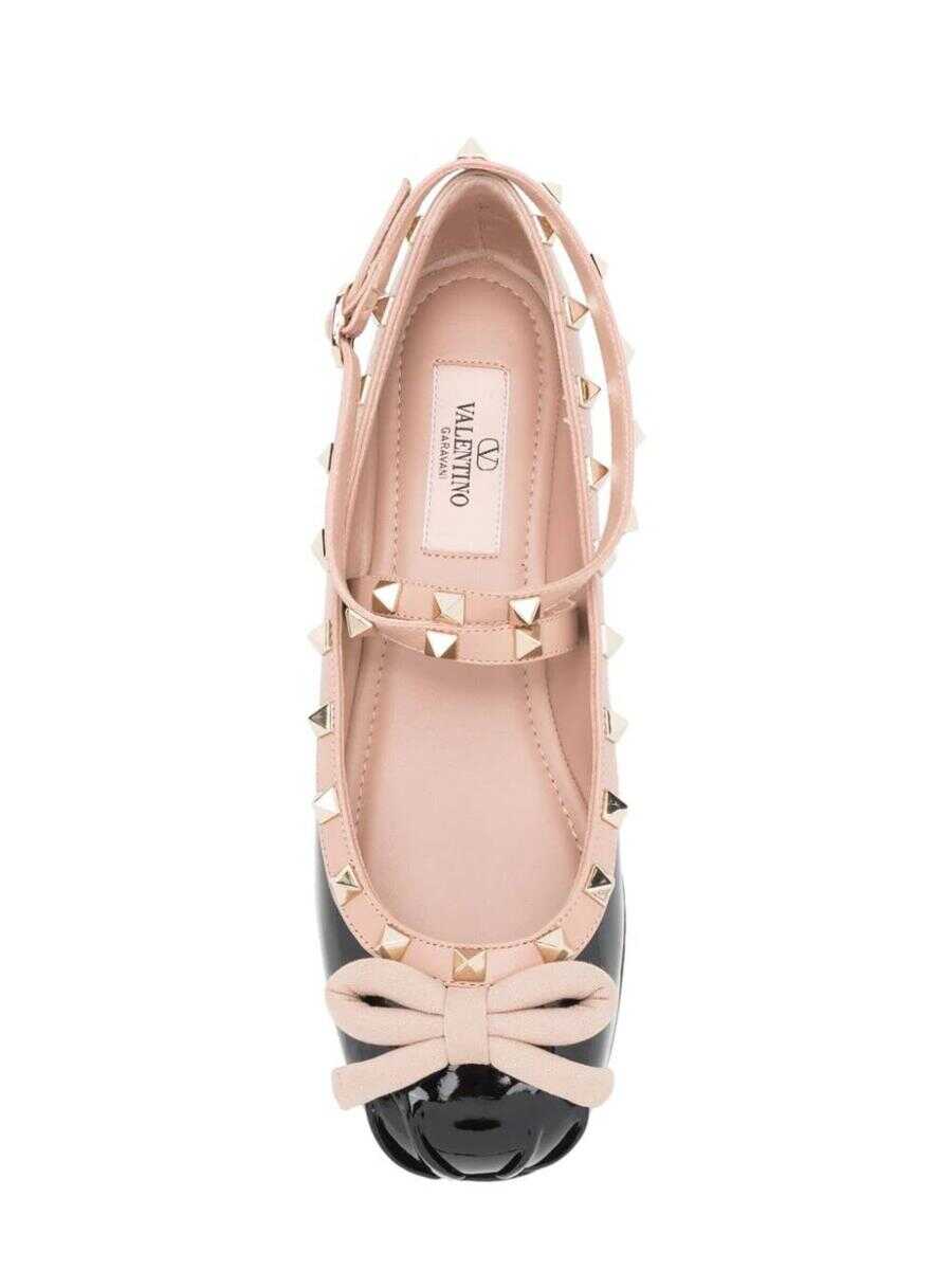black/beige calf leather patent finish gold-tone Rockstud detailing bow detailing square toe buckle-fastening ankle strap branded insole flat leather sole