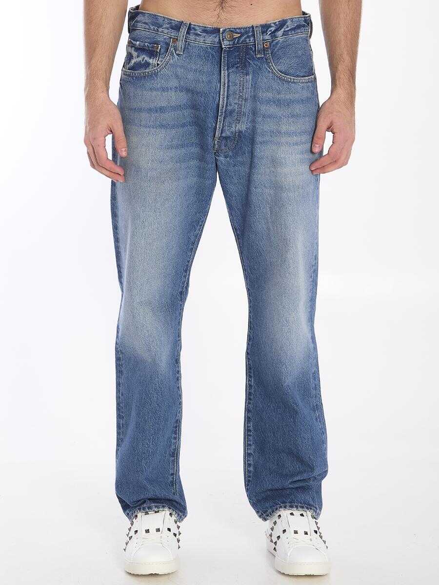 Valentino trousers in light blue denim. They feature a button closure, five-pocket design, belt loops and Chez Valentino leather patch at the back. Loose fit.