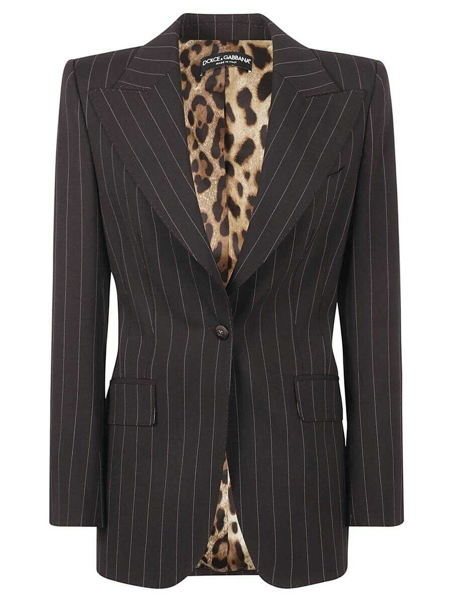 single-breasted striped blazer from DOLCE & GABBANA featuring black, virgin wool blend, vertical stripe pattern, wide peak lapels, front button fastening, long sleeves, leopard print lining and two side flap pockets.