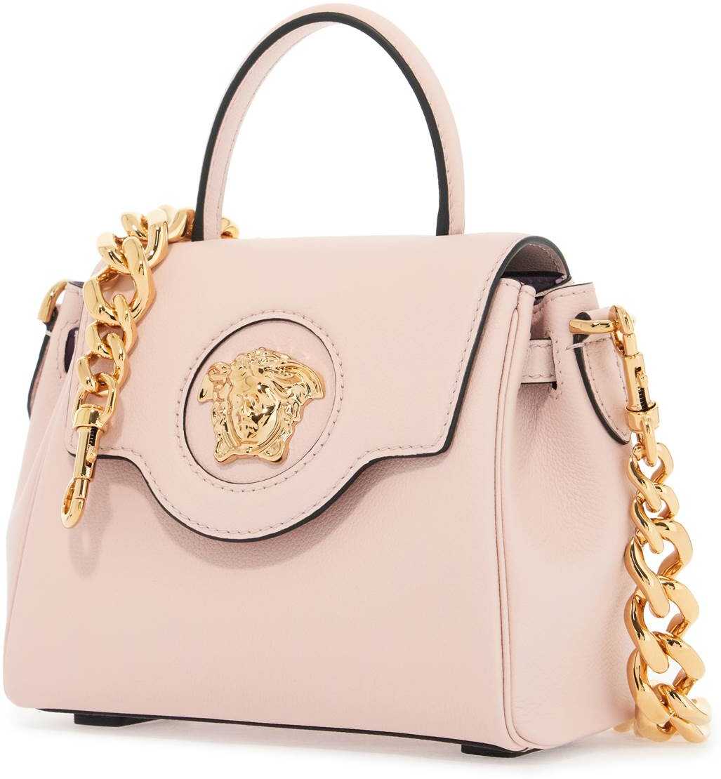 La Medusa Mini bag by Versace crafted in grained leather, featuring flap with magnetic button closure and the iconic metal Medusa head. Single handle, removable chain shoulder strap and removable and adjustable crossbody shoulder strap in leather. Gold-tone logo lettering print on the back, side straps, contrasting leather interior with an open flat pocket. Versace Gold finished metalware.